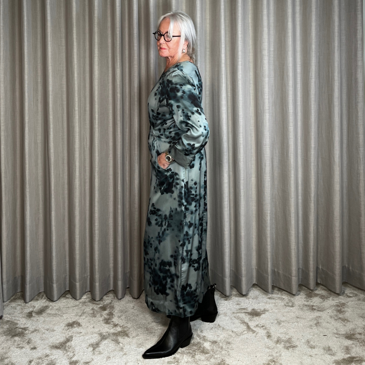 Smuk kjole med kunstfærdigt frostfarvet print.