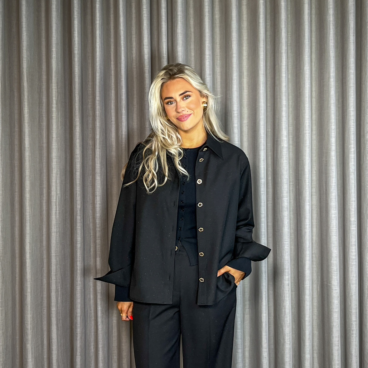 Den er designet med en tidløs krave, lange ærmer med manchetter og gennemgående knaplukning, hvor de smukke, blomsterformede knapper giver et dekorativt og feminint udtryk.