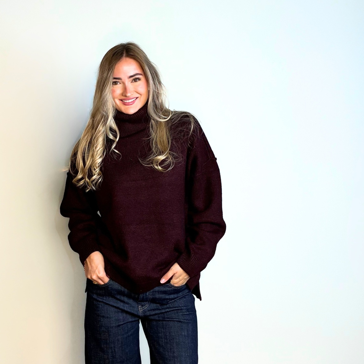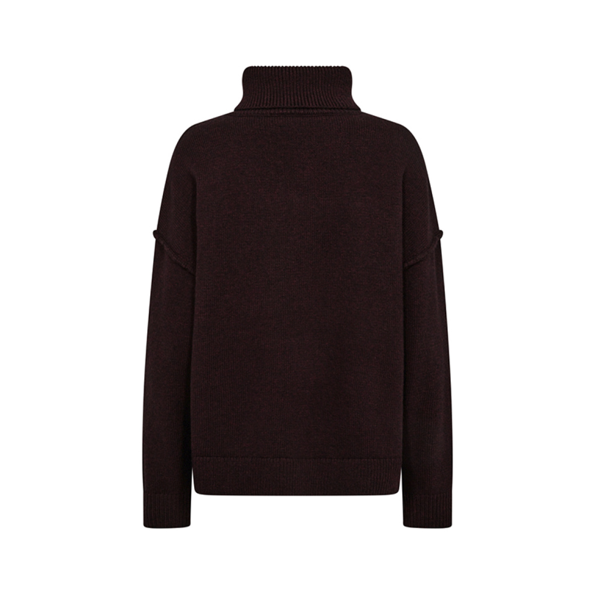 Klassisk strik med høj rullekrave og løst, lige snit.