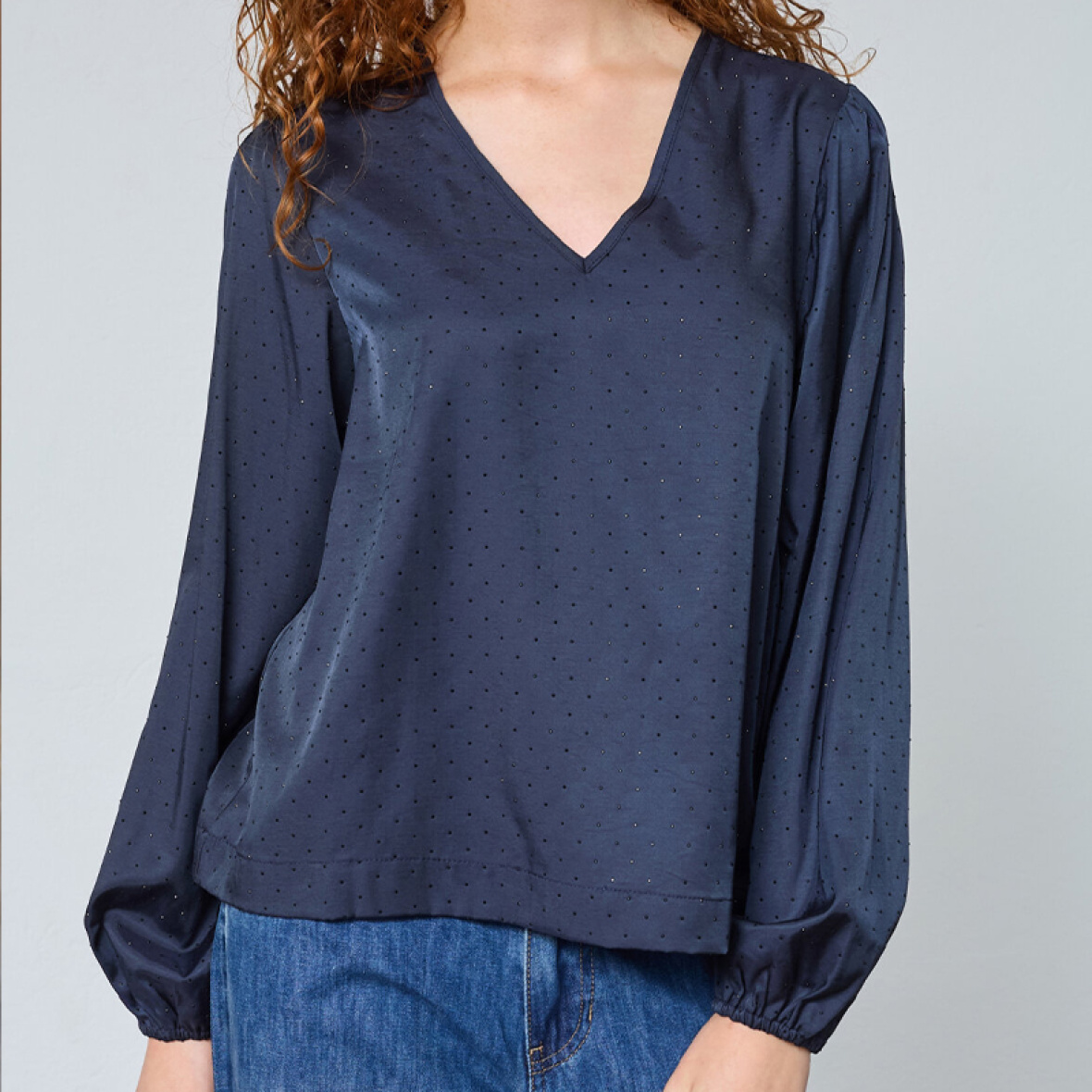 Blusen love1458 har V-hals og lange, voluminøse ærmer.
