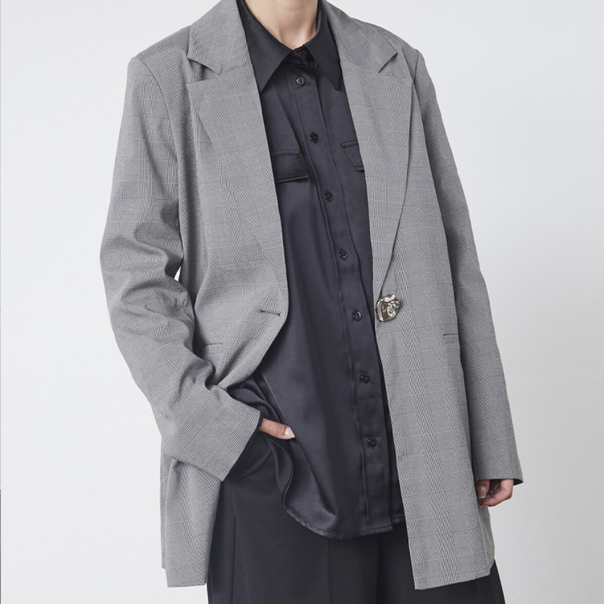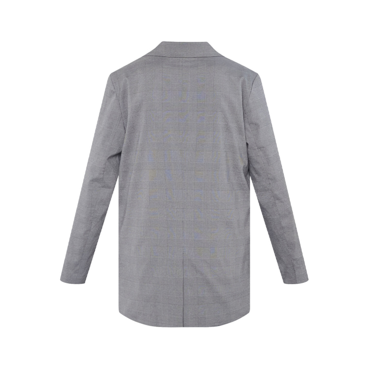 En elegant grå og sort ternet blazer med et klassisk snit, der giver et stilfuldt og sofistikeret look.