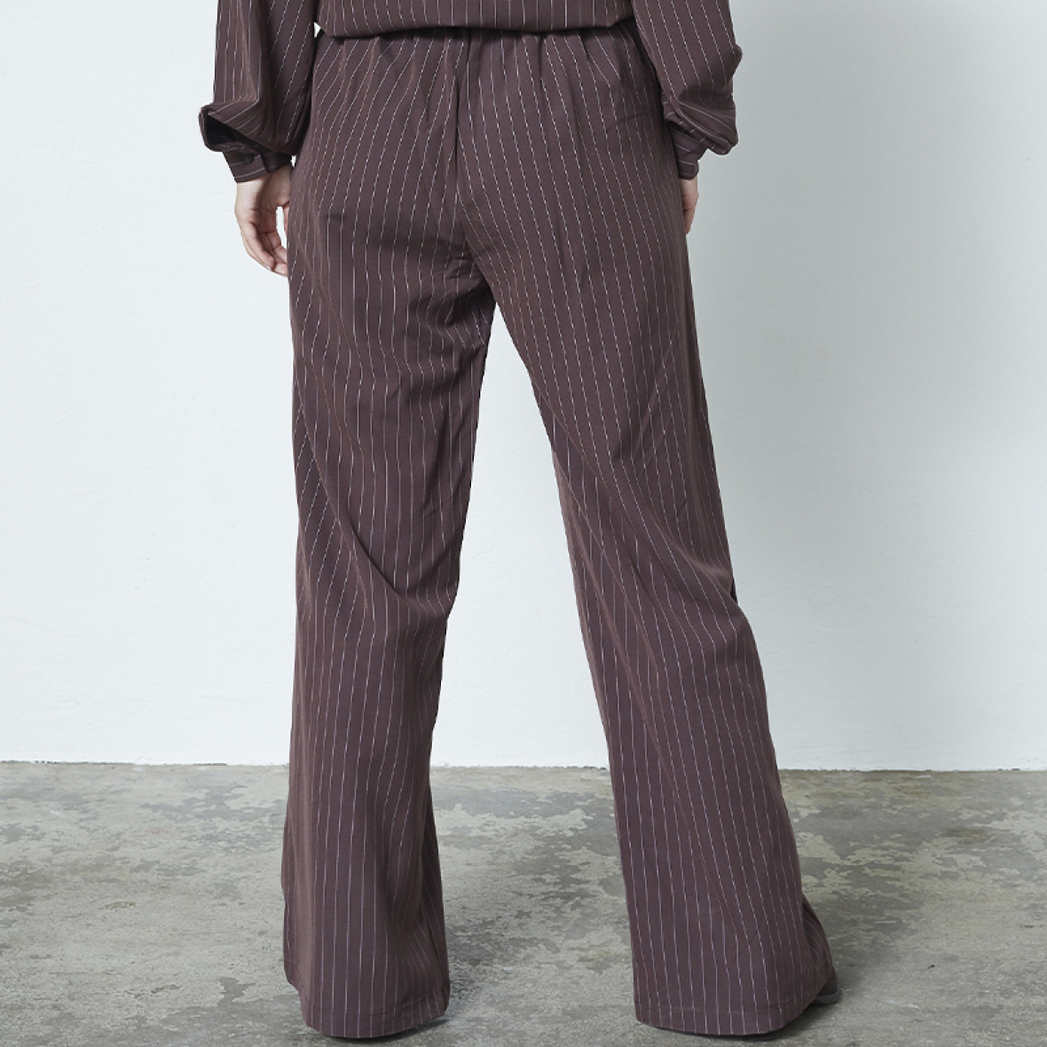 Bukserne har et klassisk, lige ben med fine lodrette striber, som giver en flatterende og elegant silhuet.