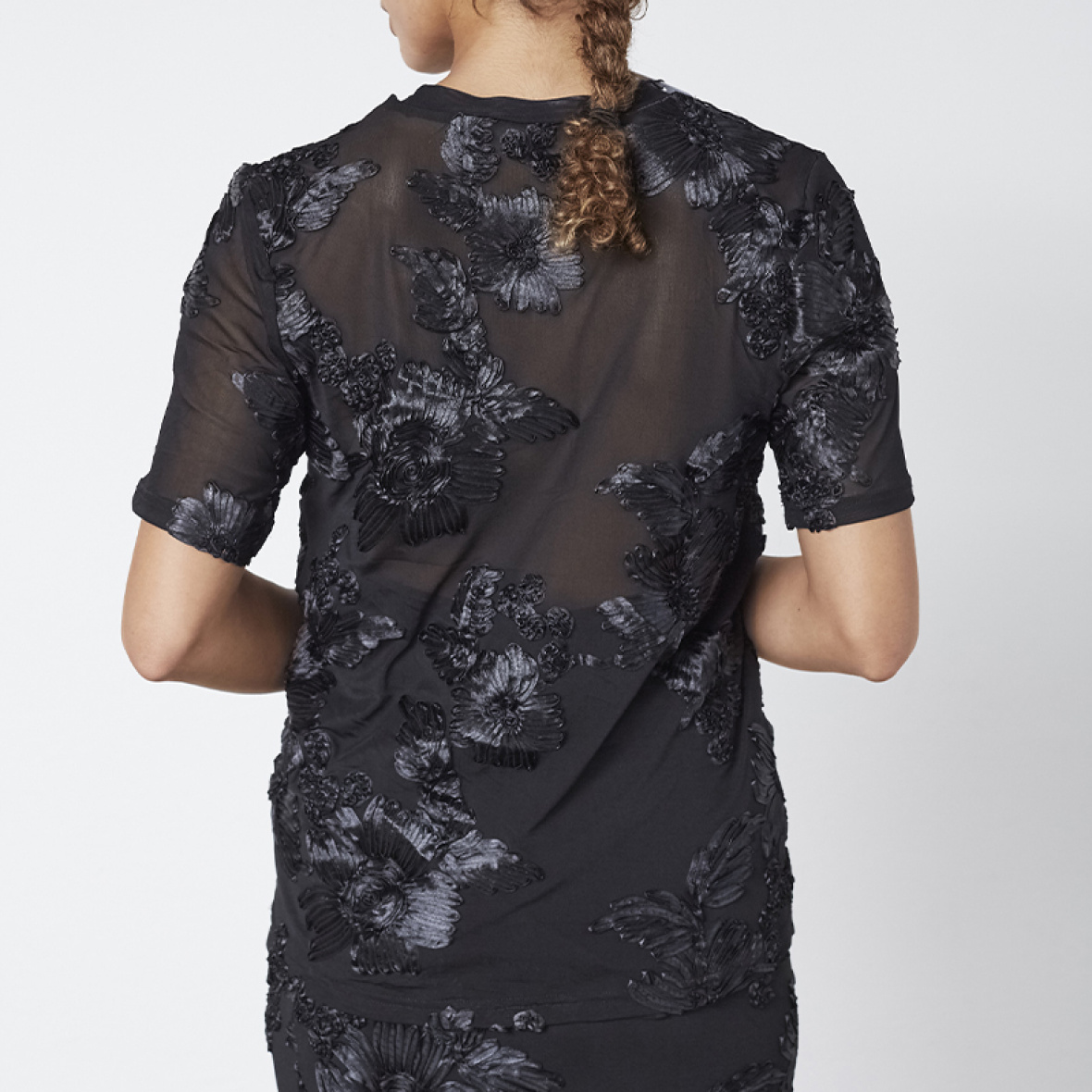 T-shirten har rund halsudskæring og giver et feminint udtryk.