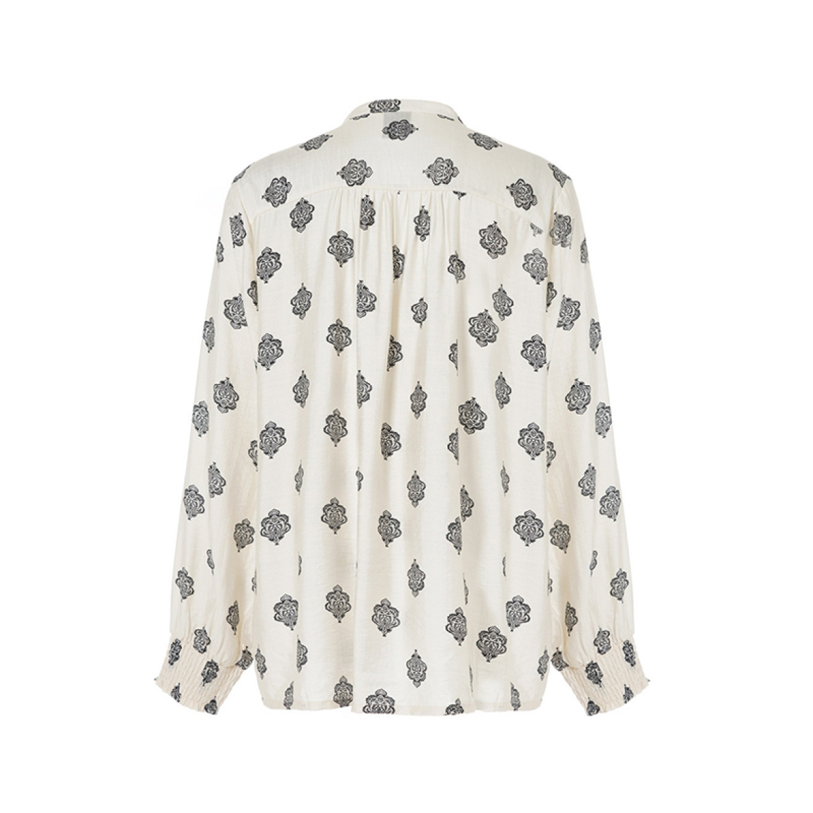En elegant hvid skjorte med sort mønster og en lille V-udskæring.