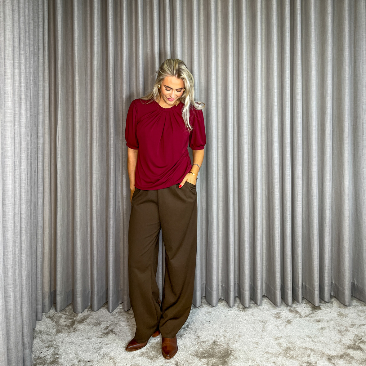 Det ensfarvede materiale på denne Grazia bluse er perfekt at style