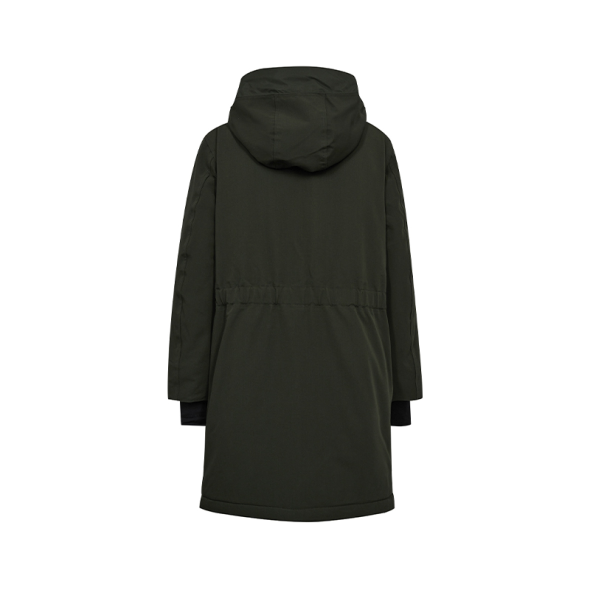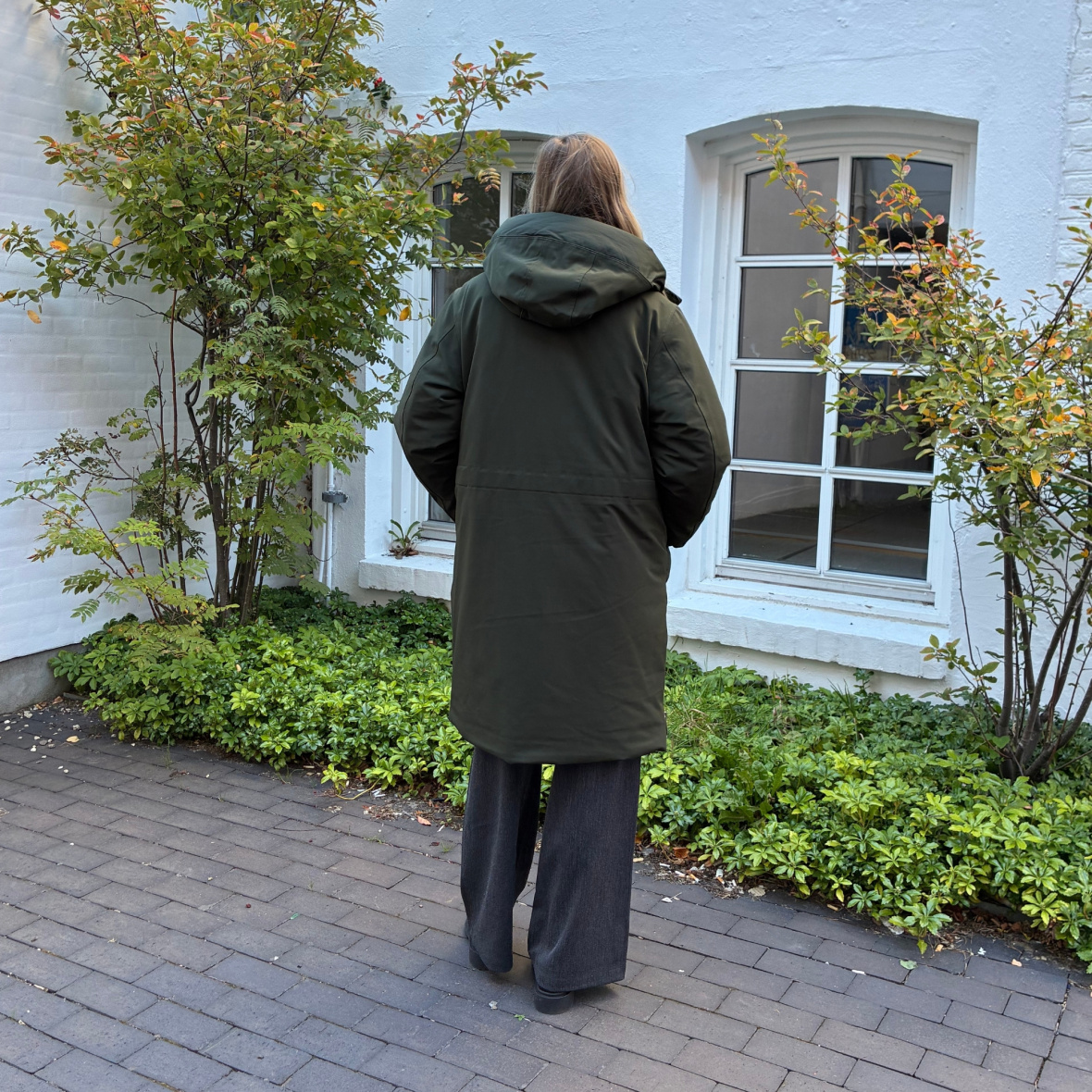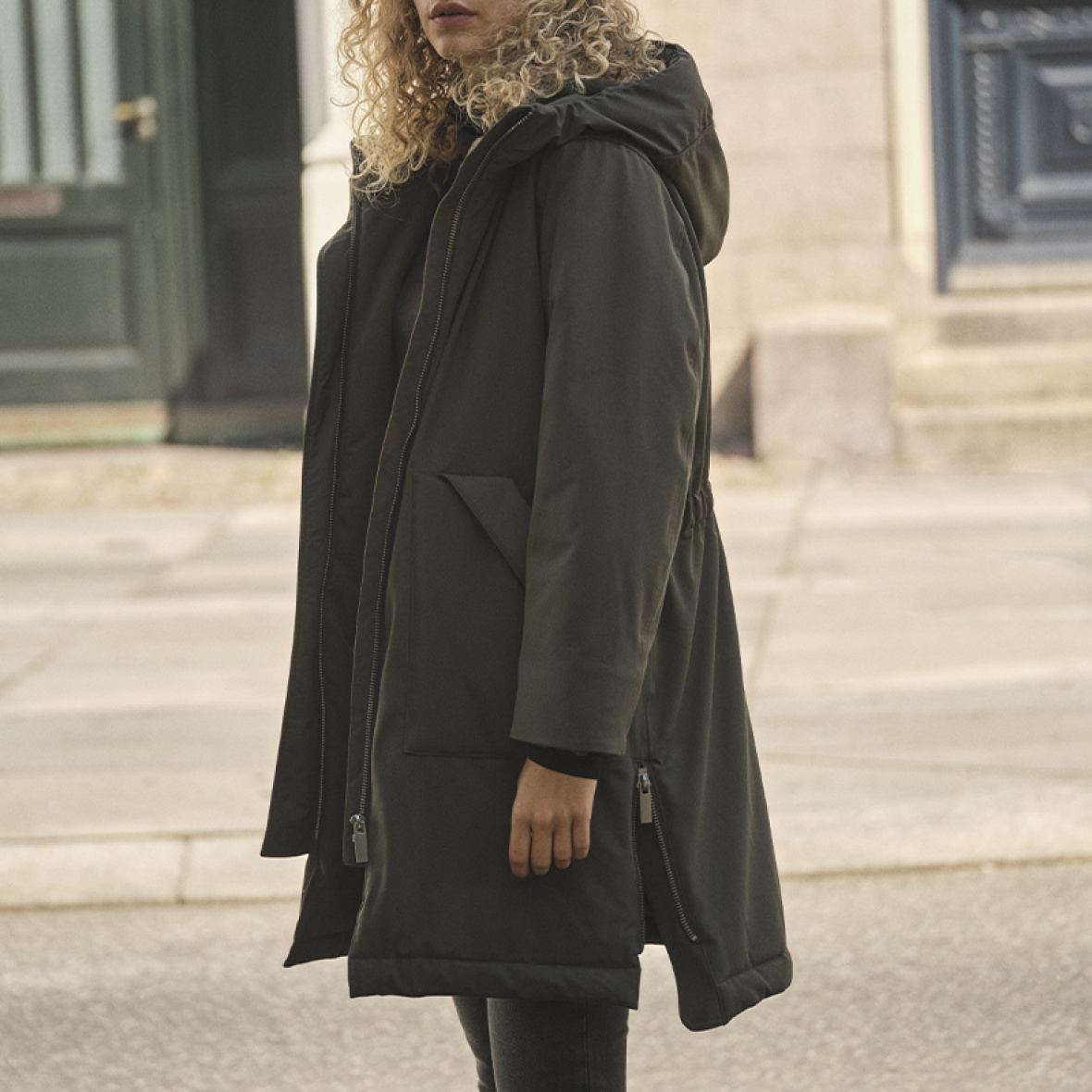 Hold dig varm hele vinteren i denne lange jakke med hætte og skjult frontlukning for et stilrent og moderne look.
