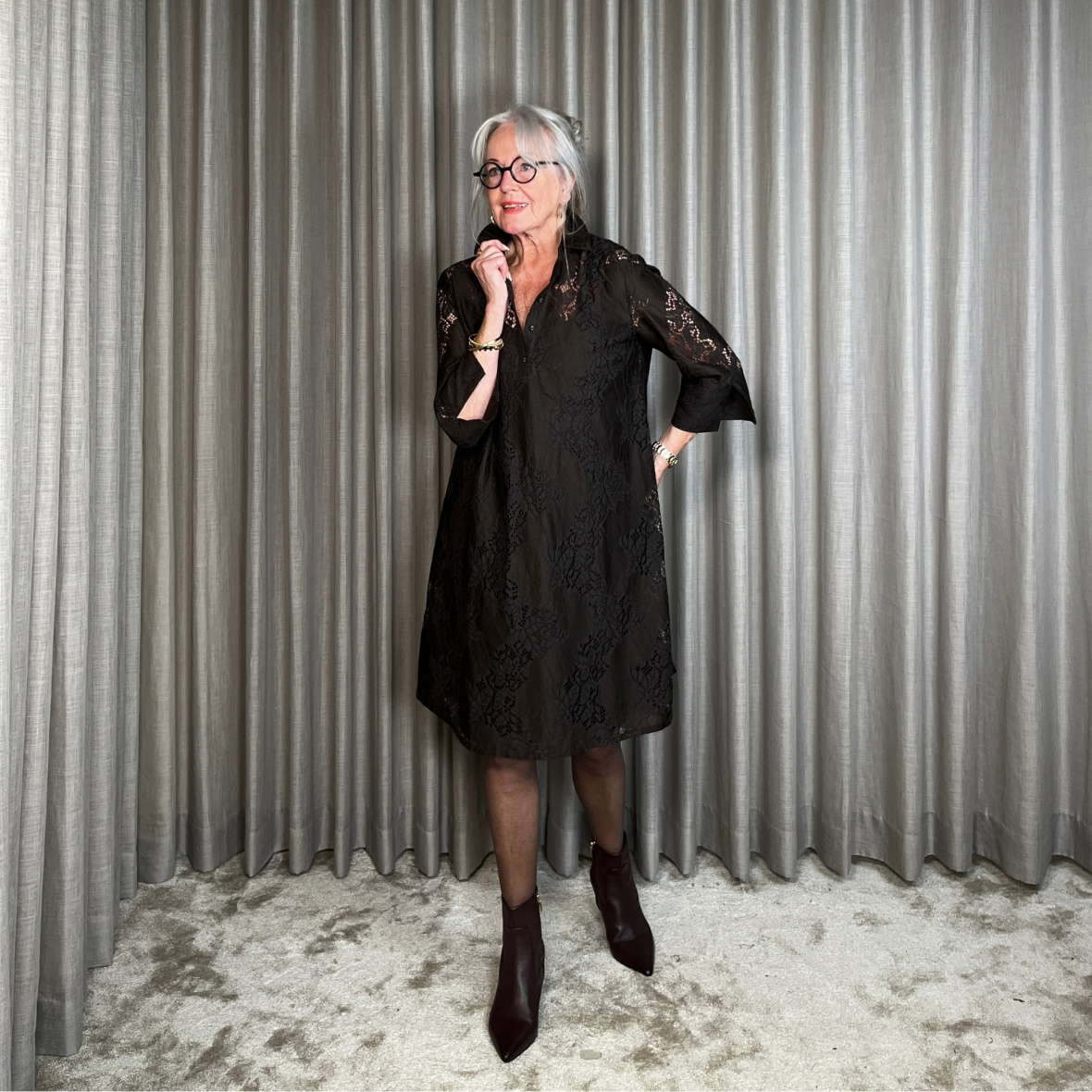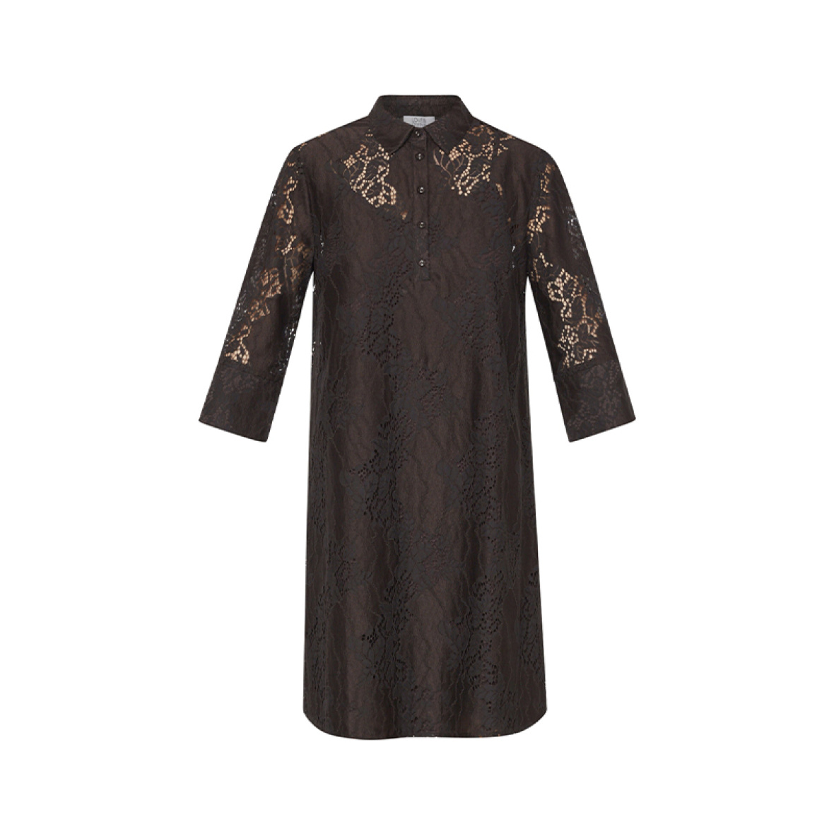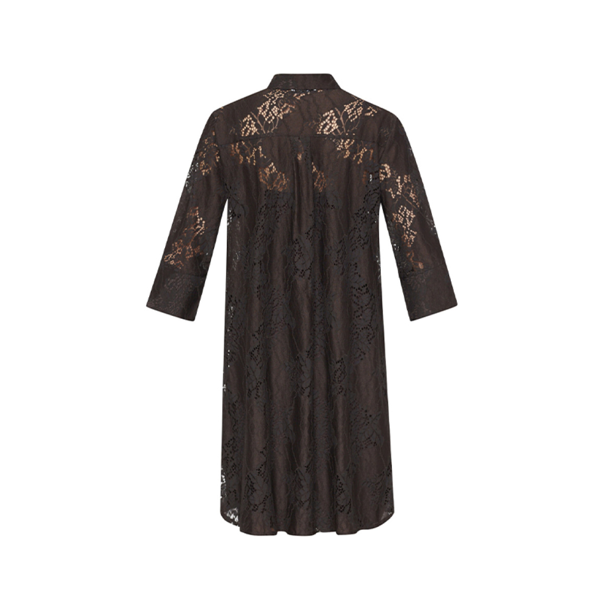 Smuk brun blondekjole med løstsiddende pasform, der giver et elegant og afslappet look.