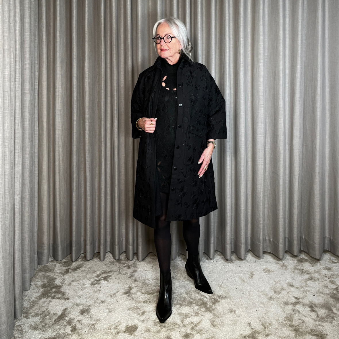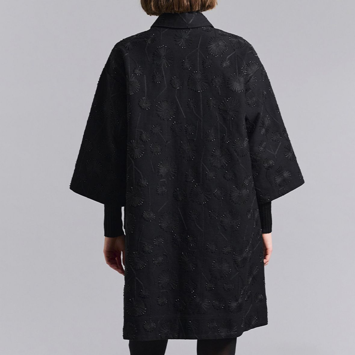 Jakken er udført i sort med smukke broderede mønstre, der giver et eksklusivt og unikt udtryk.