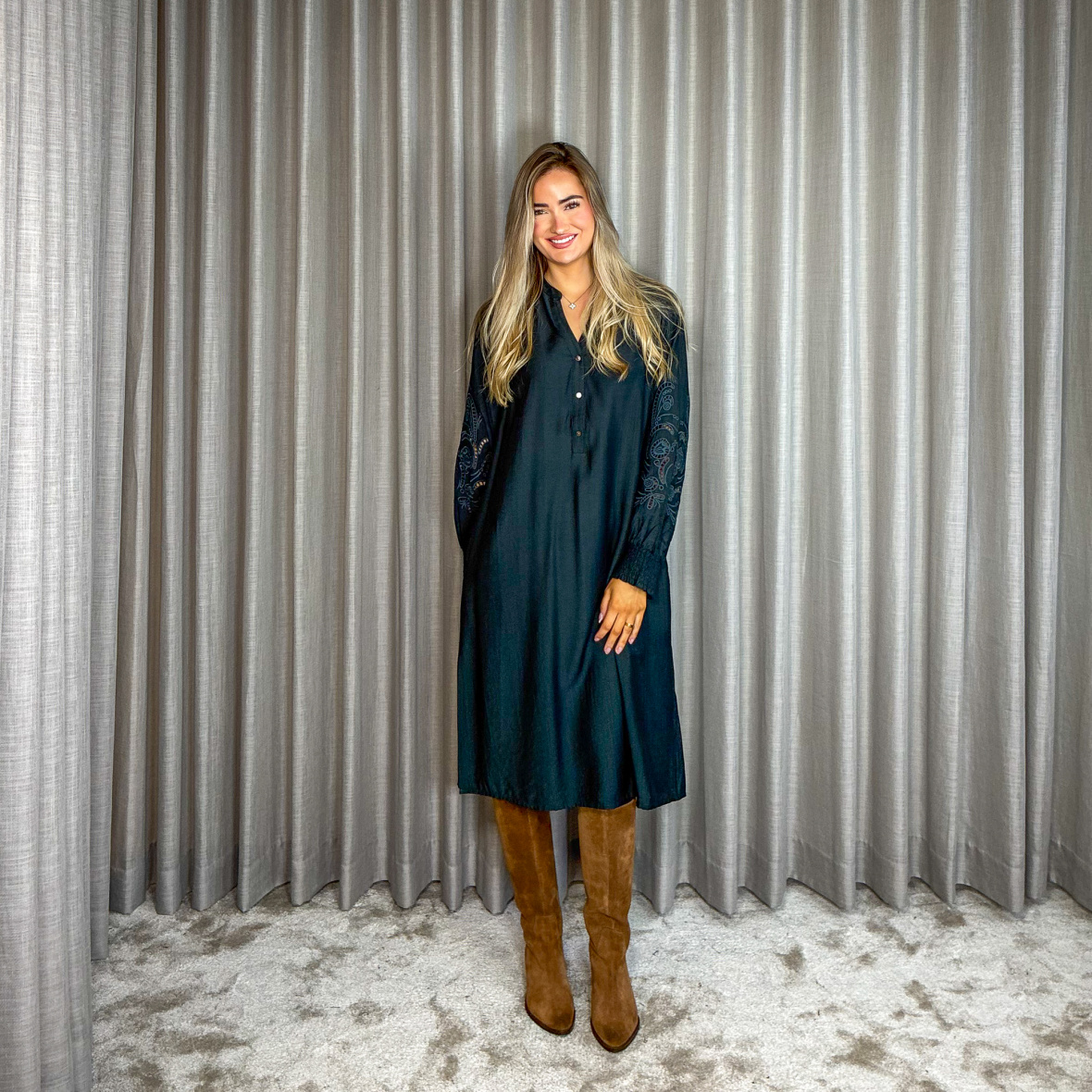 Kjolen har V-udskæring med fin knapdetalje og lange ærmer med smock ved håndleddene.