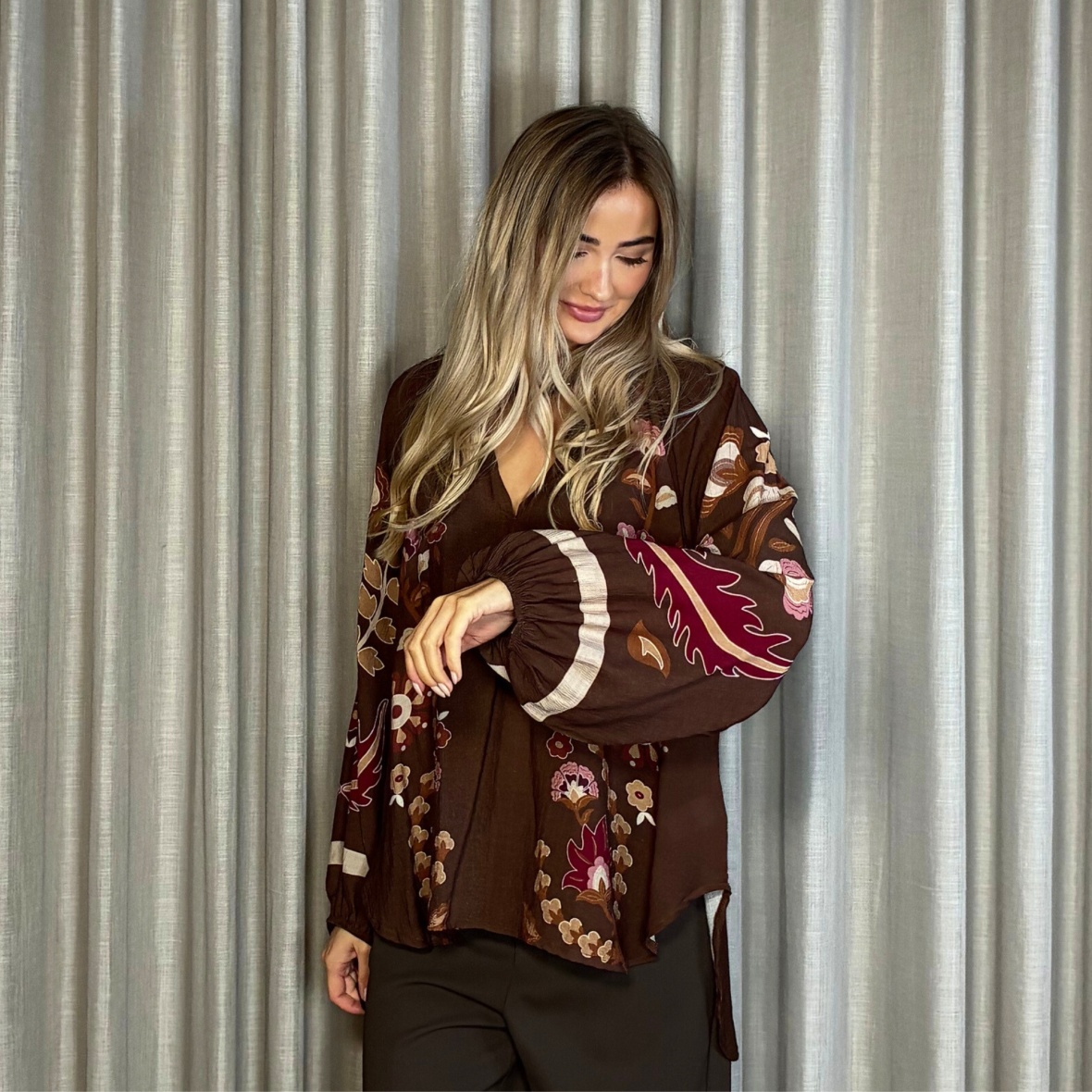 Skjorten har en feminin touch med små ballonærmer, der giver et blødt og elegant udtryk.