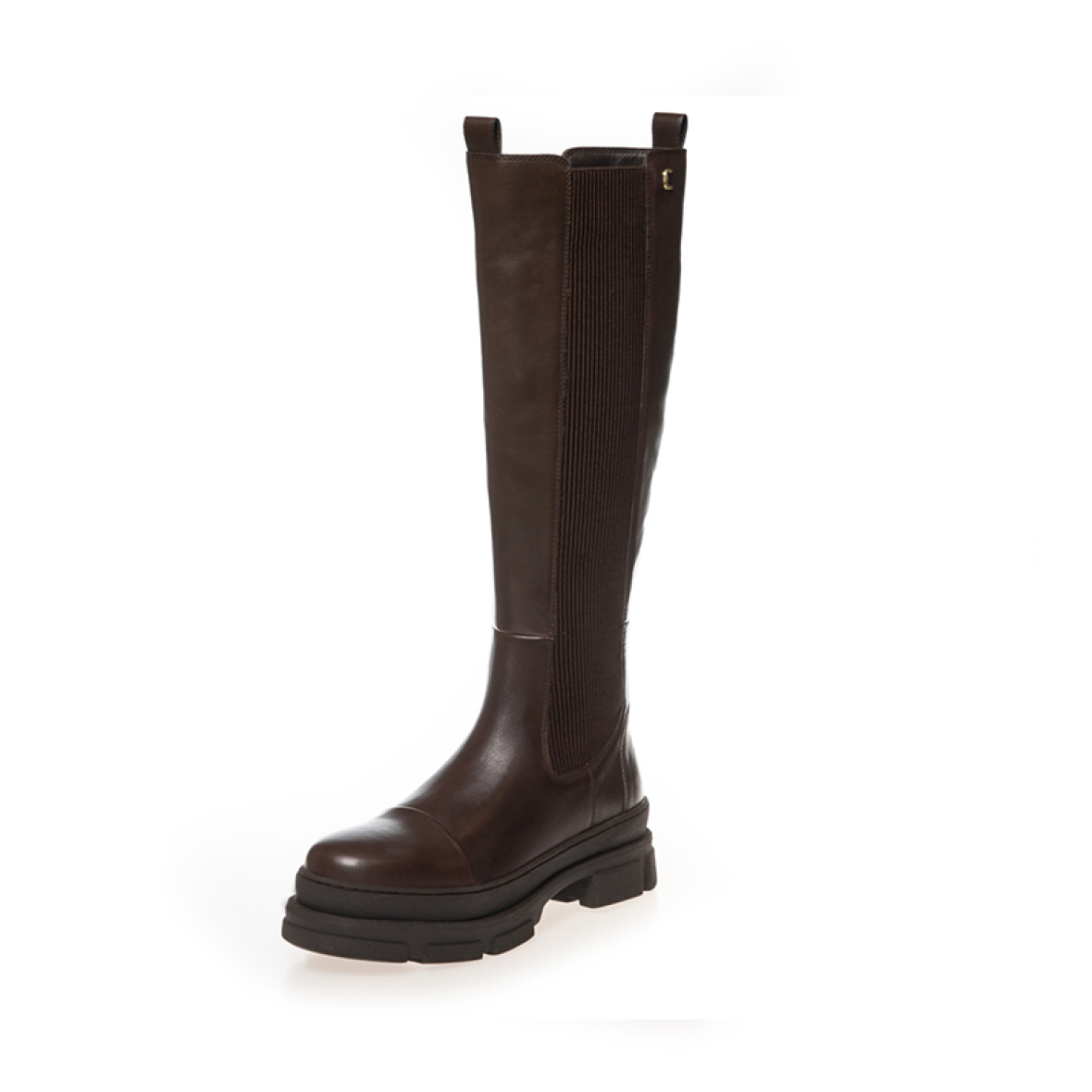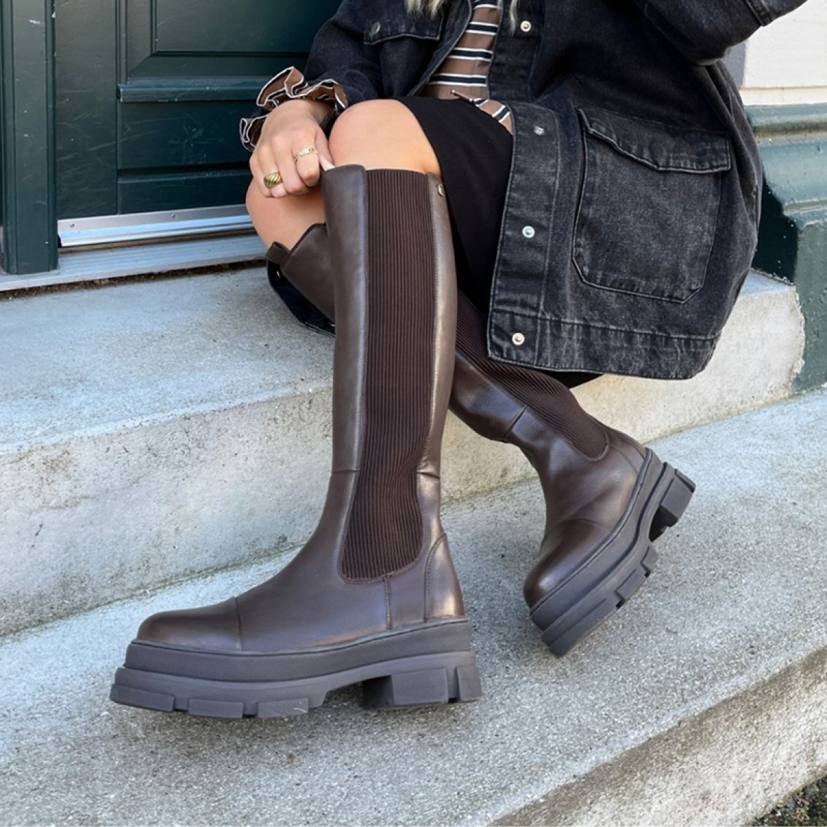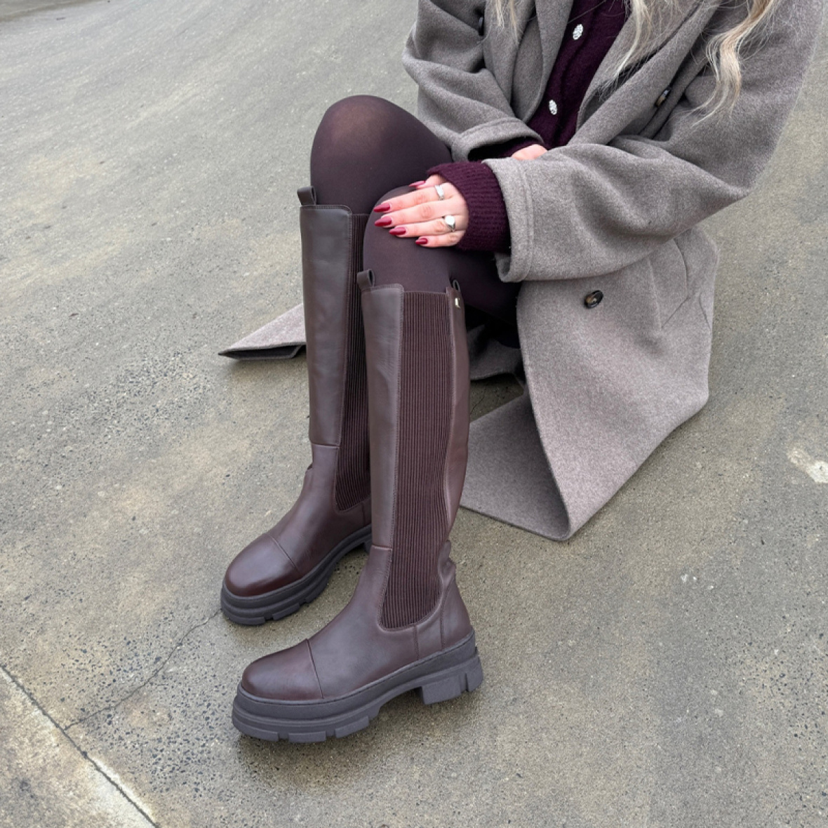 Den solide hæl giver et flot løft, mens det høje skaft fuldender det elegante look – perfekt til både kjoler og bukser.