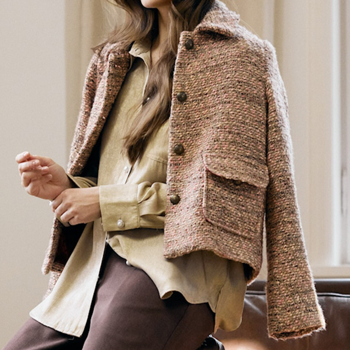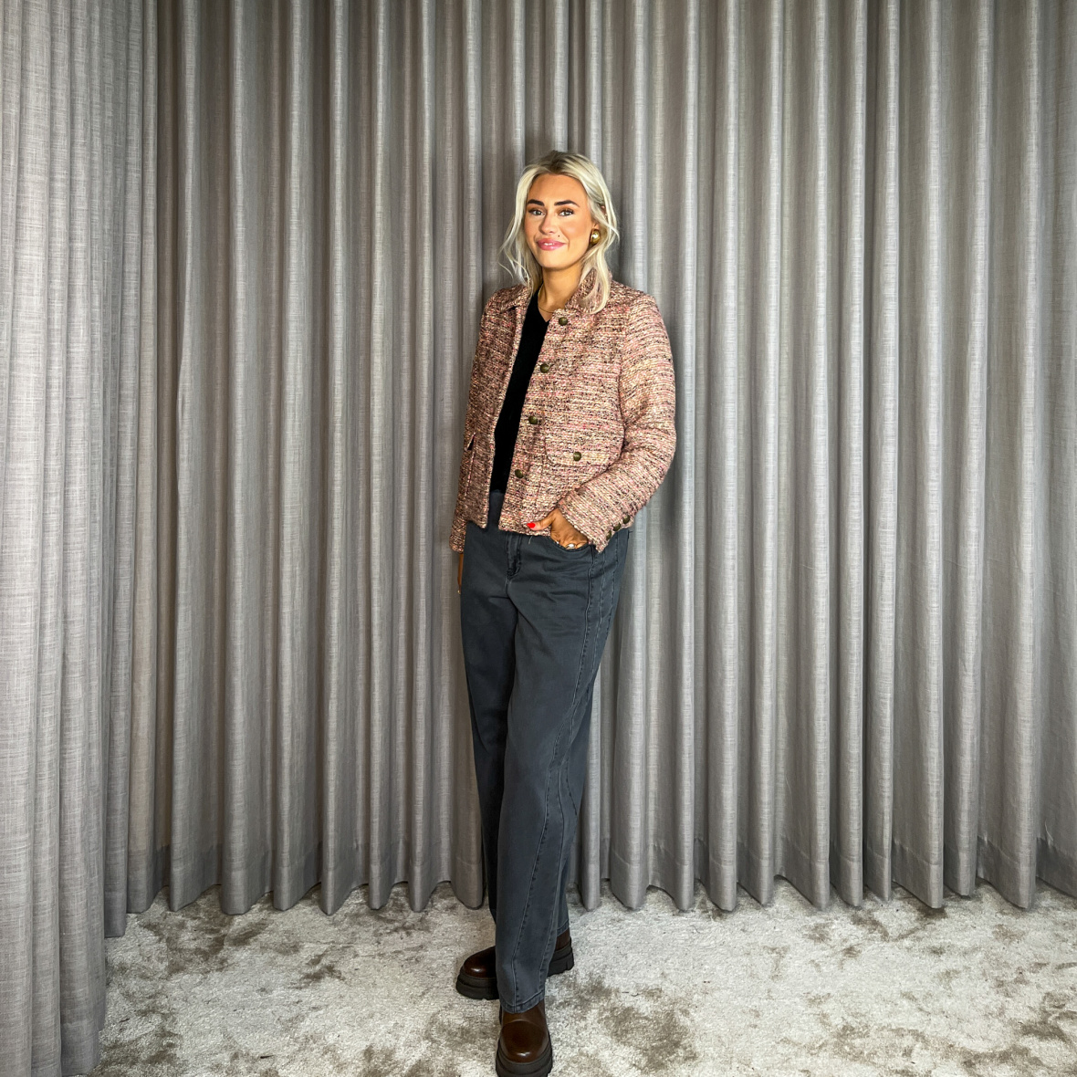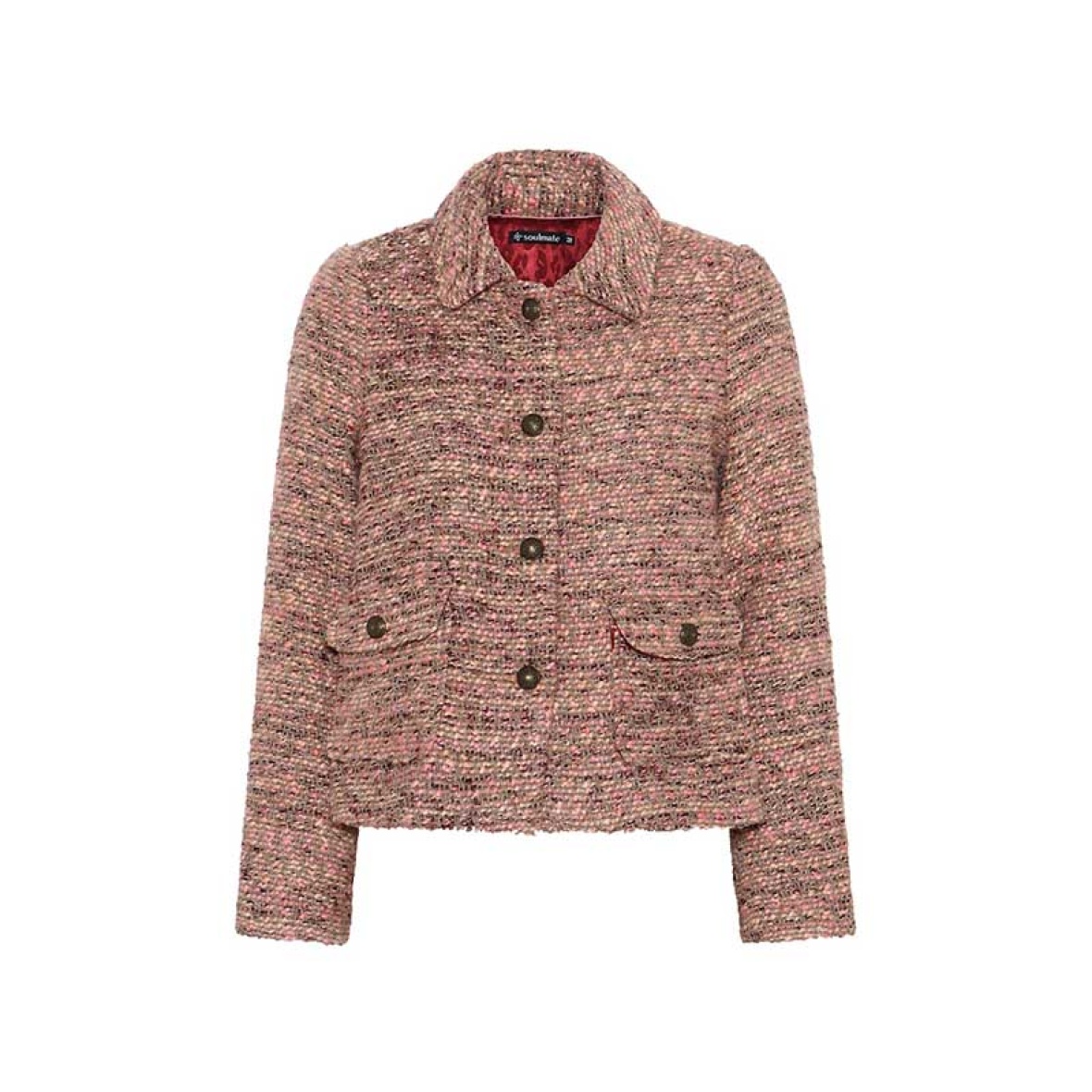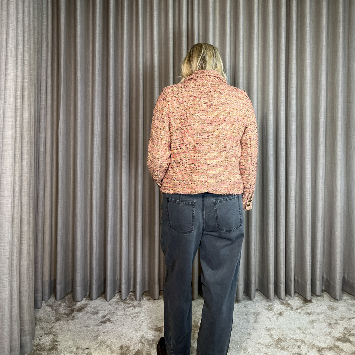 Jakken har et klassisk, kort snit og er fremstillet i en smuk tweed-lignende struktur med varme nuancer af rosa, brun og beige.