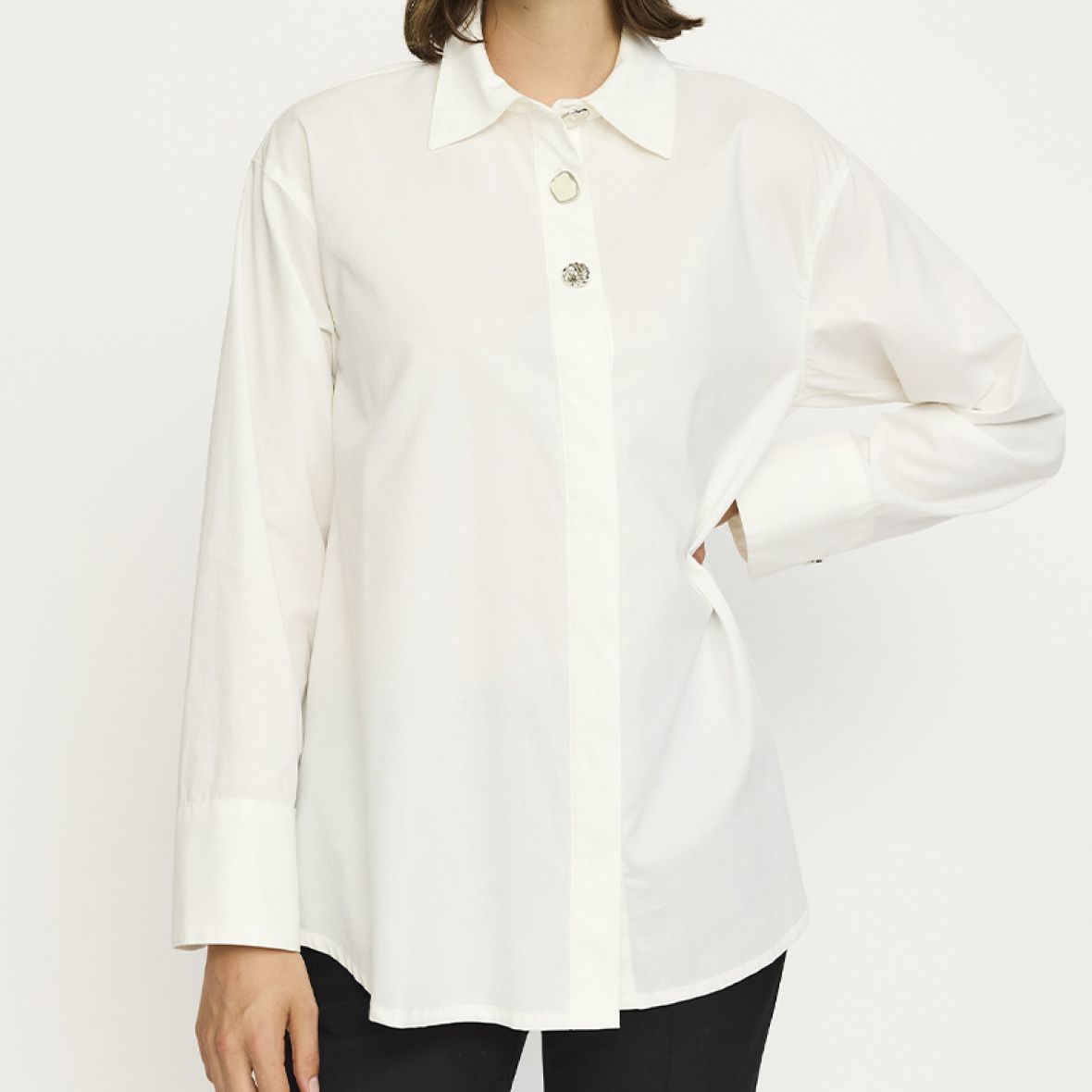 Den har et enkelt, elegant design med klassisk krave, skjult knaplukning og tre dekorative knapper foran, som tilføjer et feminint og eksklusivt touch.