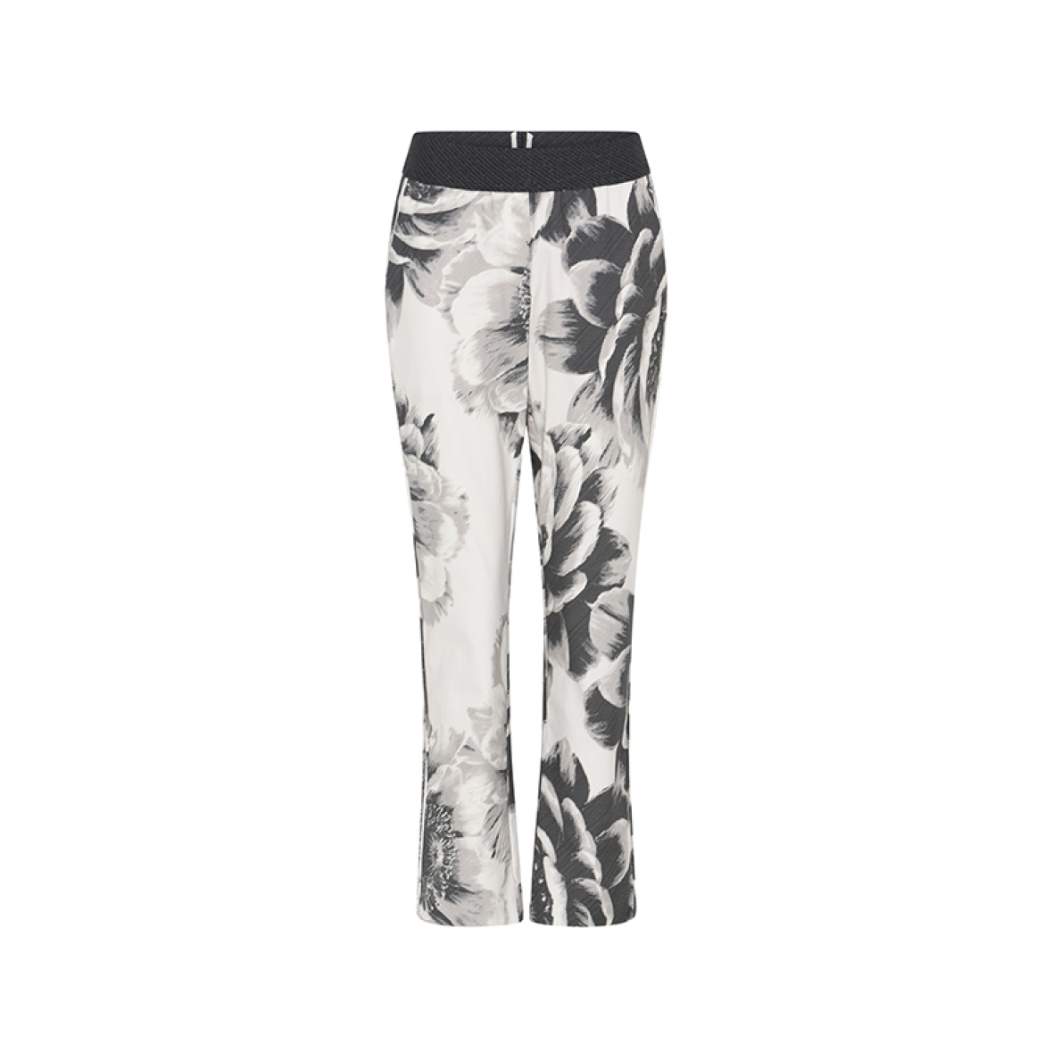 Disse elegante bukser forener luksus og komfort med deres smukke blomsterprint i kontrastfulde nuancer af sort, grå og creme.