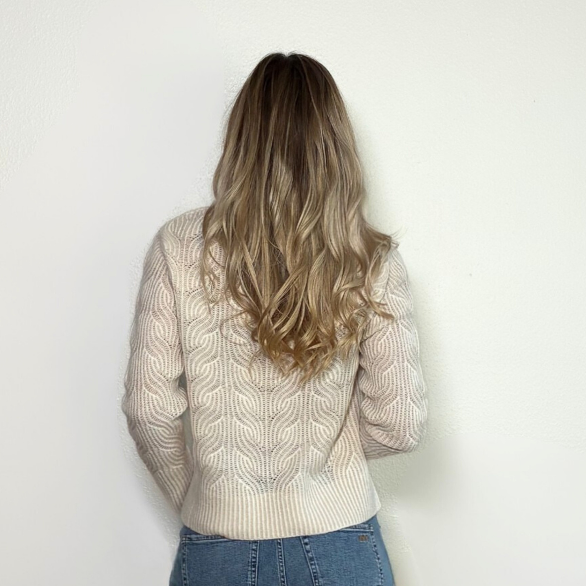 Denne klassiske striktrøje i blød cremefarvet kvalitet kombinerer komfort med raffineret design.