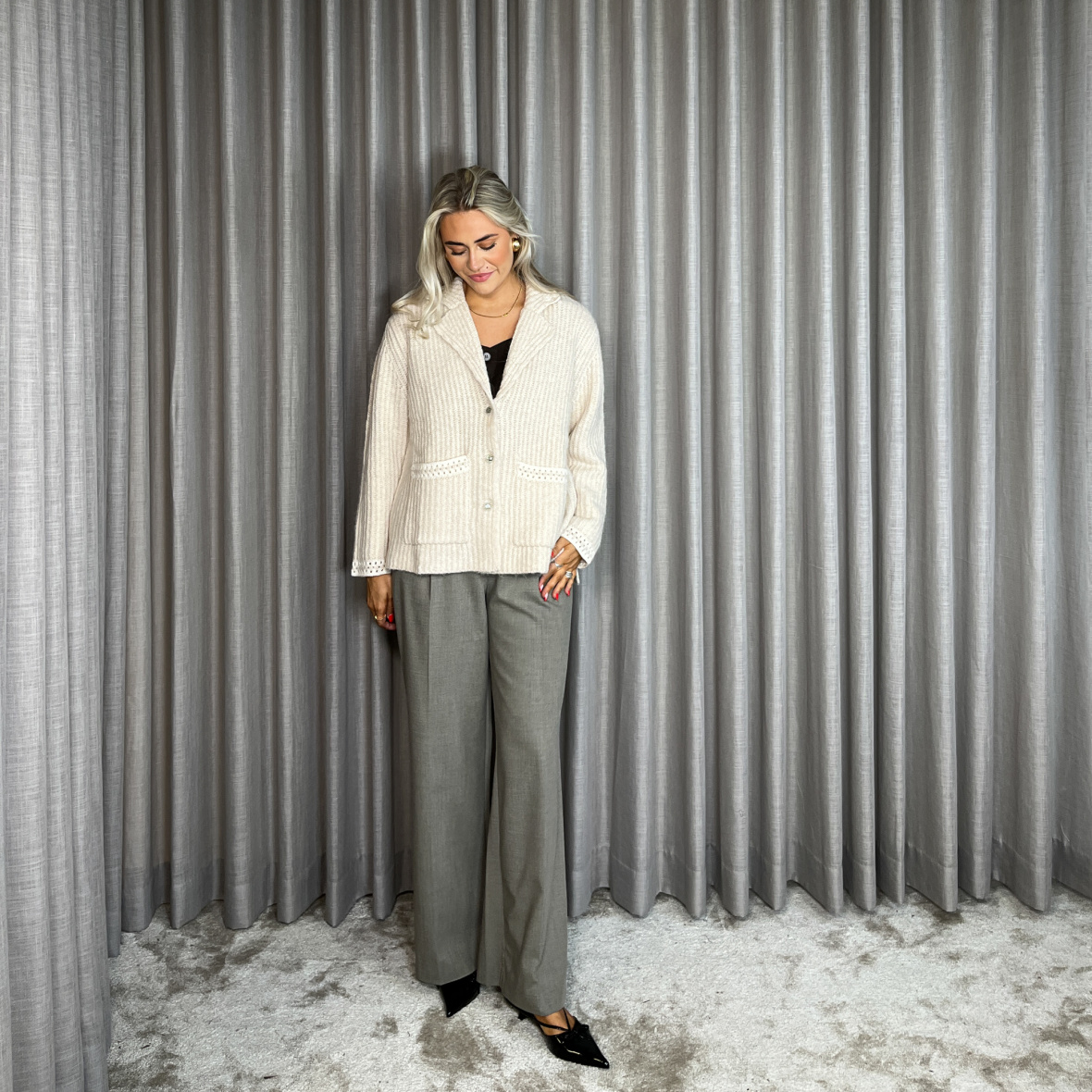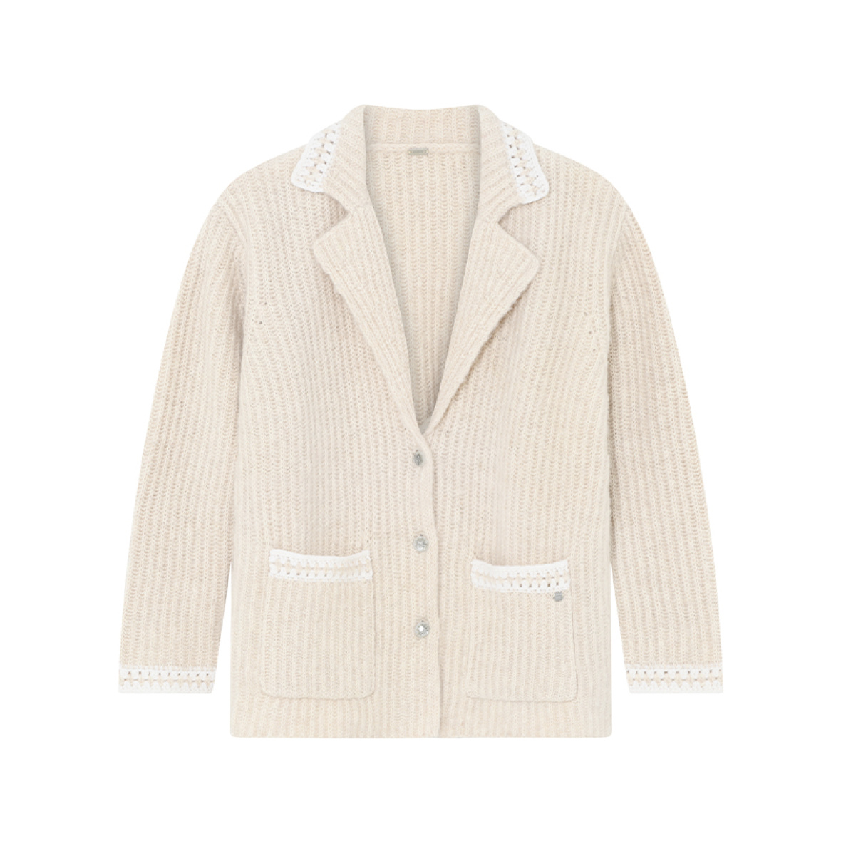 Designet er inspireret af den klassiske blazer med reverskrave, tre knapper foran og to påsatte lommer, der er dekoreret med diskret hæklet kant.