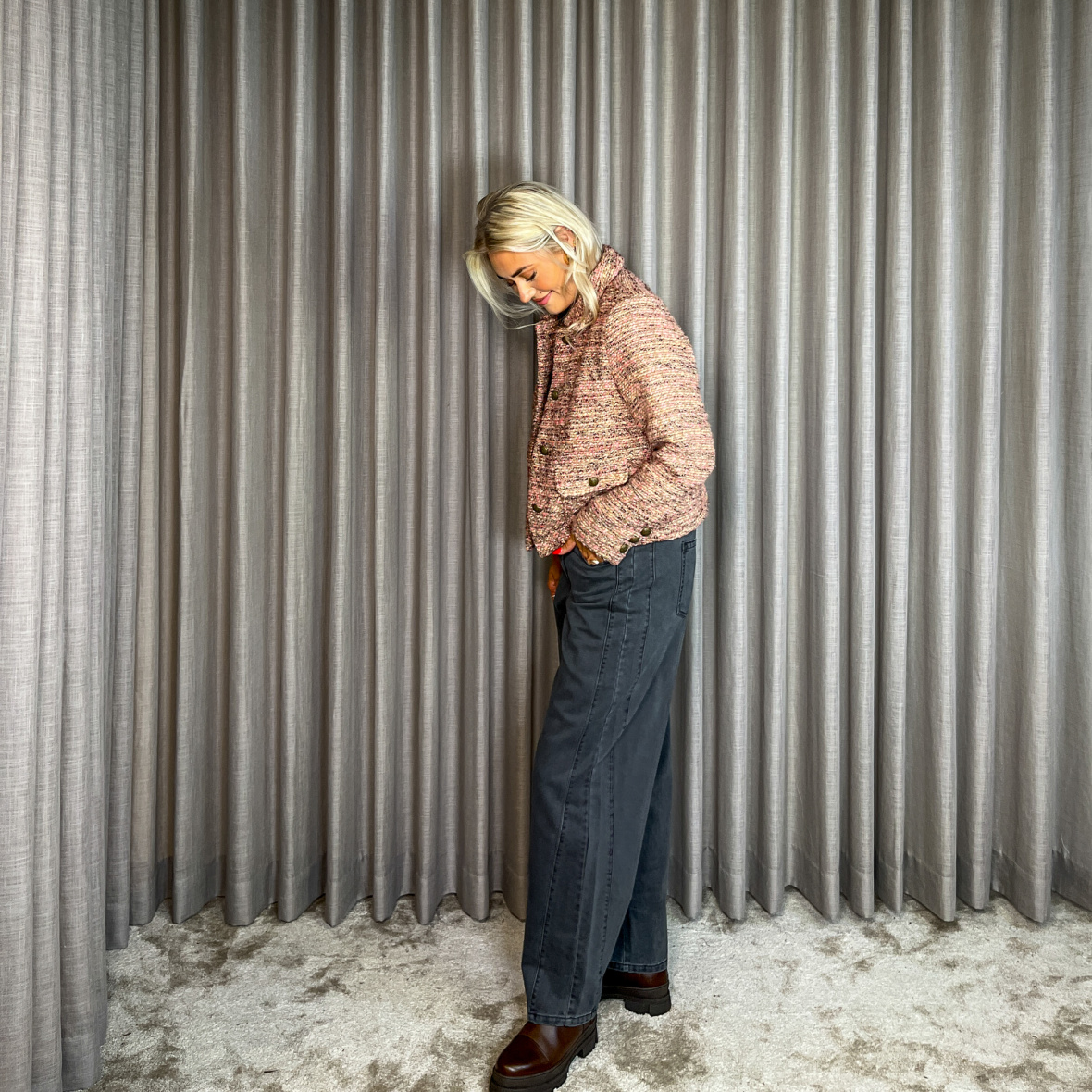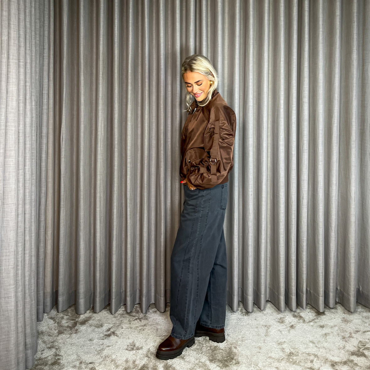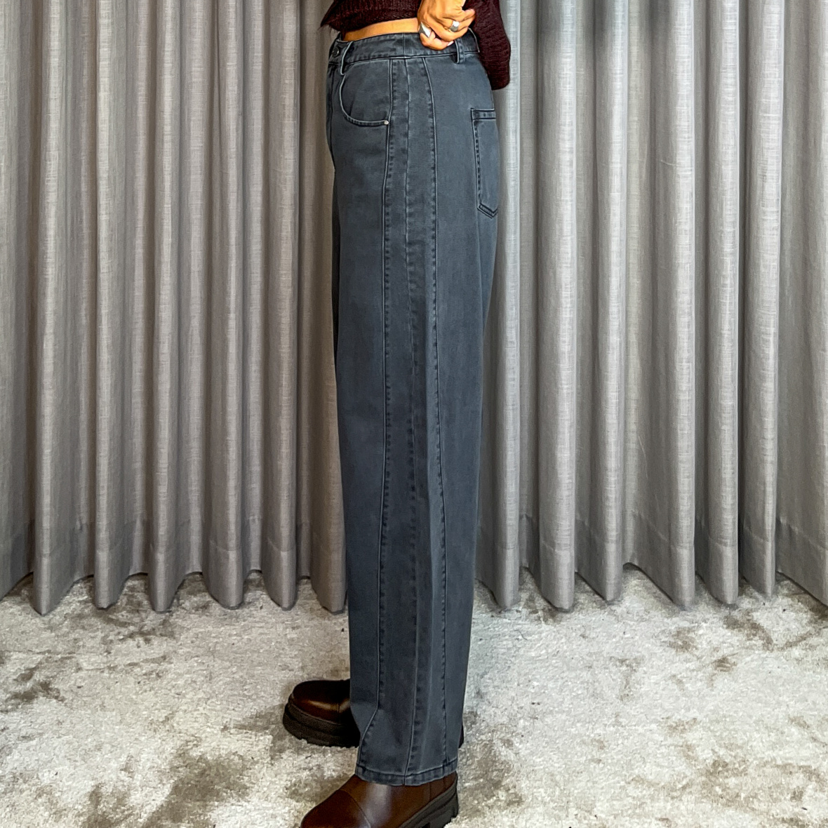 Modellen har høj talje, løse ben og et cool, minimalistisk udtryk, der passer perfekt til både hverdag og aften.