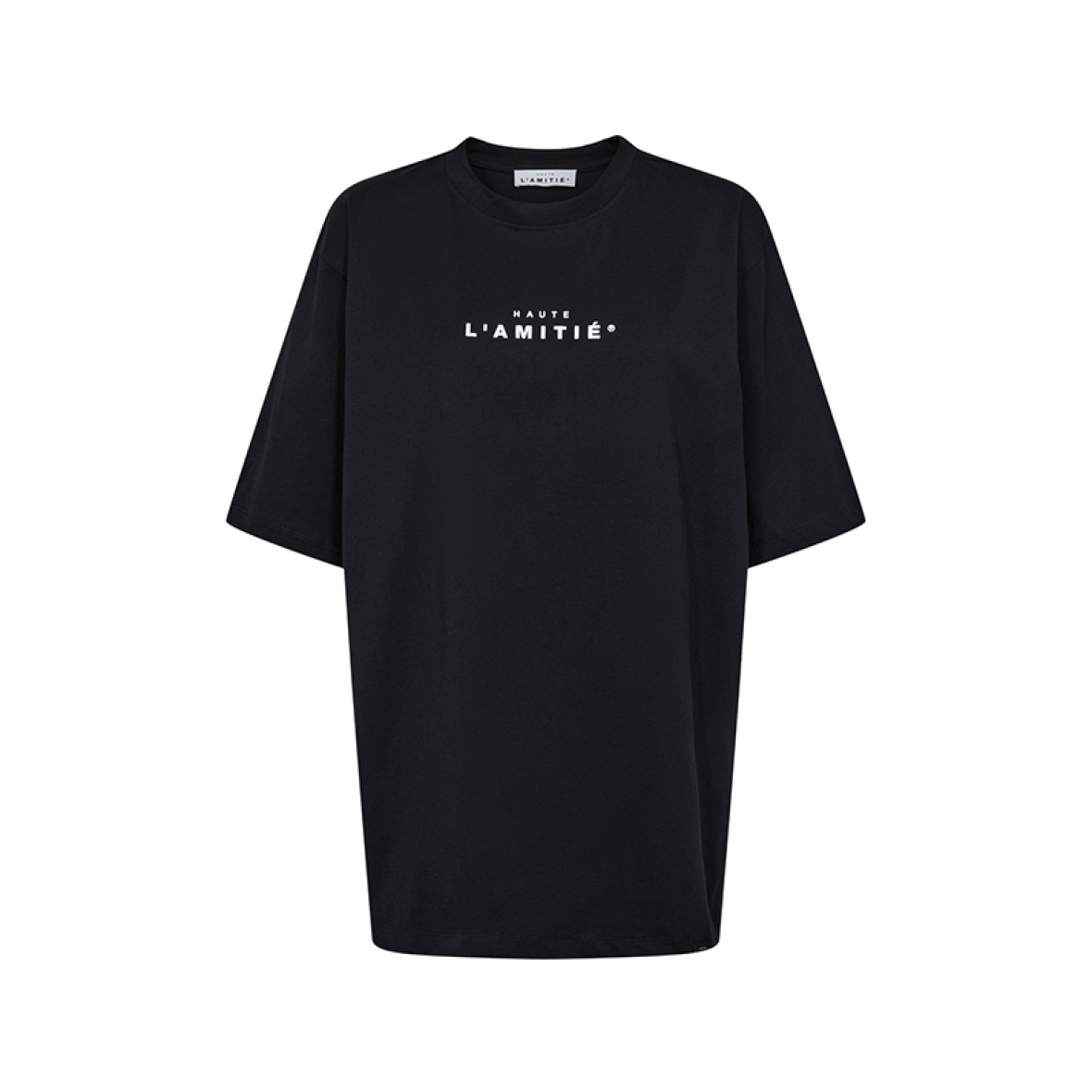 Den har en løs, oversize pasform og et minimalistisk hvidt logo-print på brystet, som giver et moderne og luksuriøst streetwear-look.