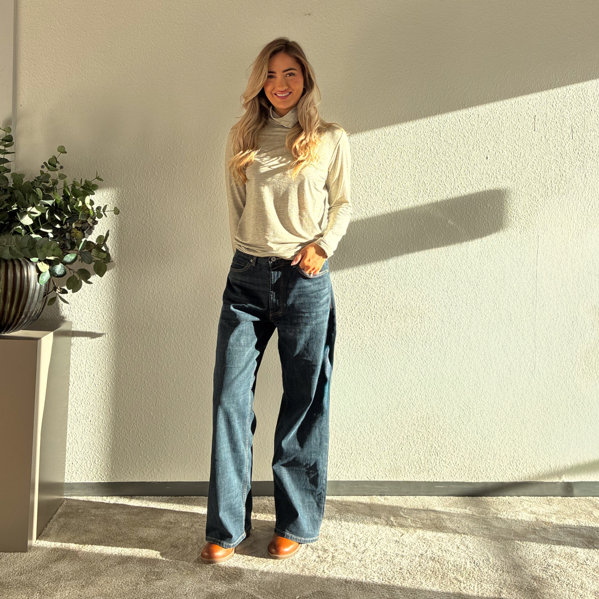 Blusen har en løs, draperet rullekrave og lange ærmer – perfekt til både afslappede outfits og som lag under jakker eller blazere.