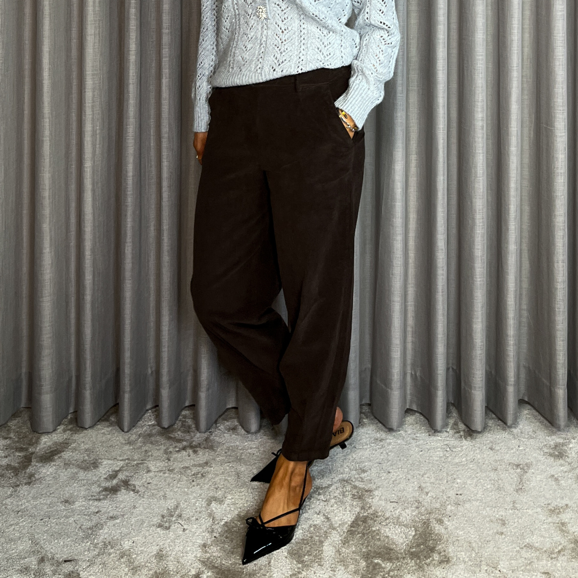 Disse mørkebrune fløjlsbukser kombinerer tidløs stil med uovertruffen komfort.