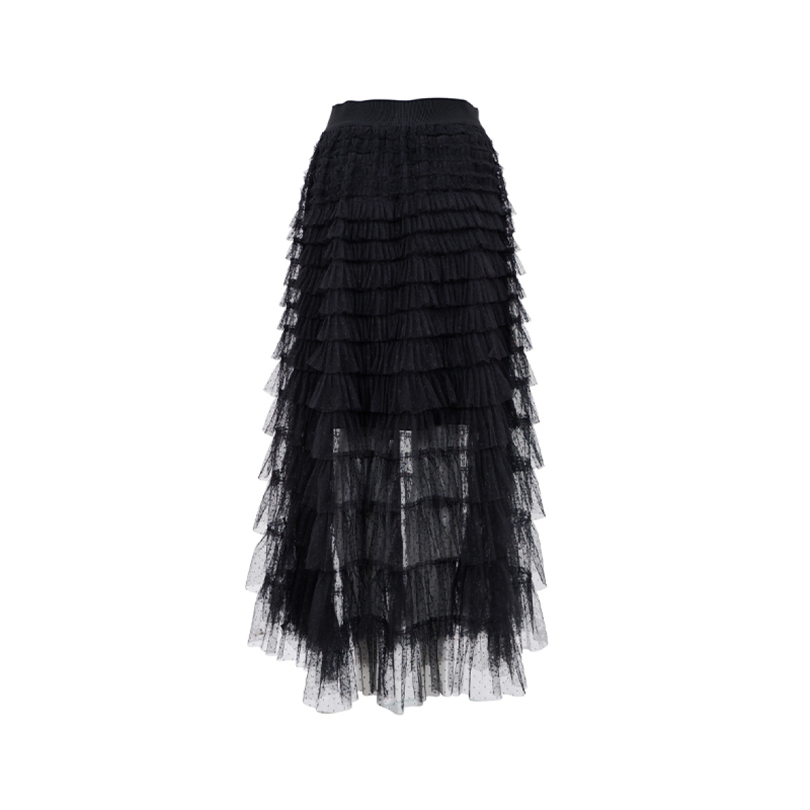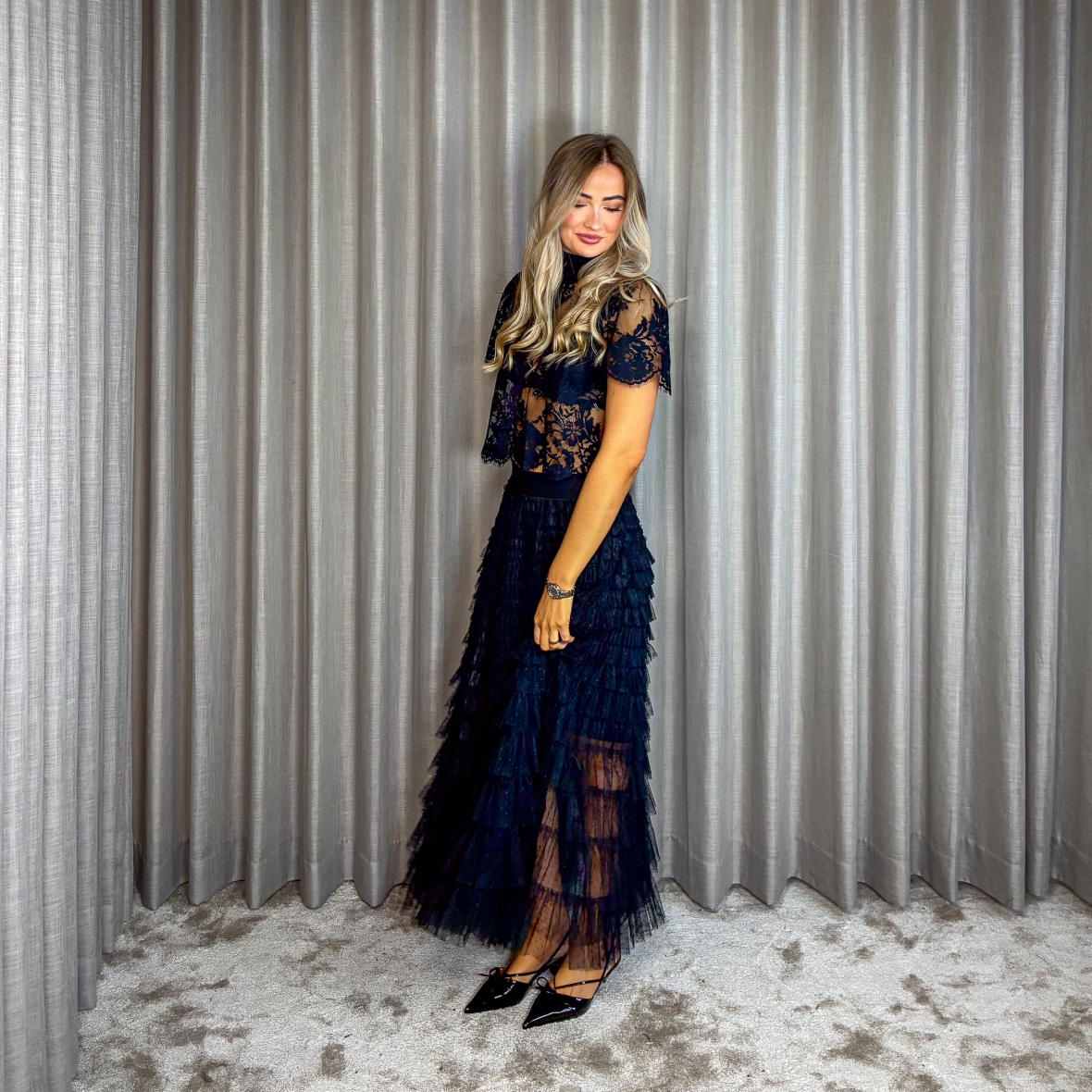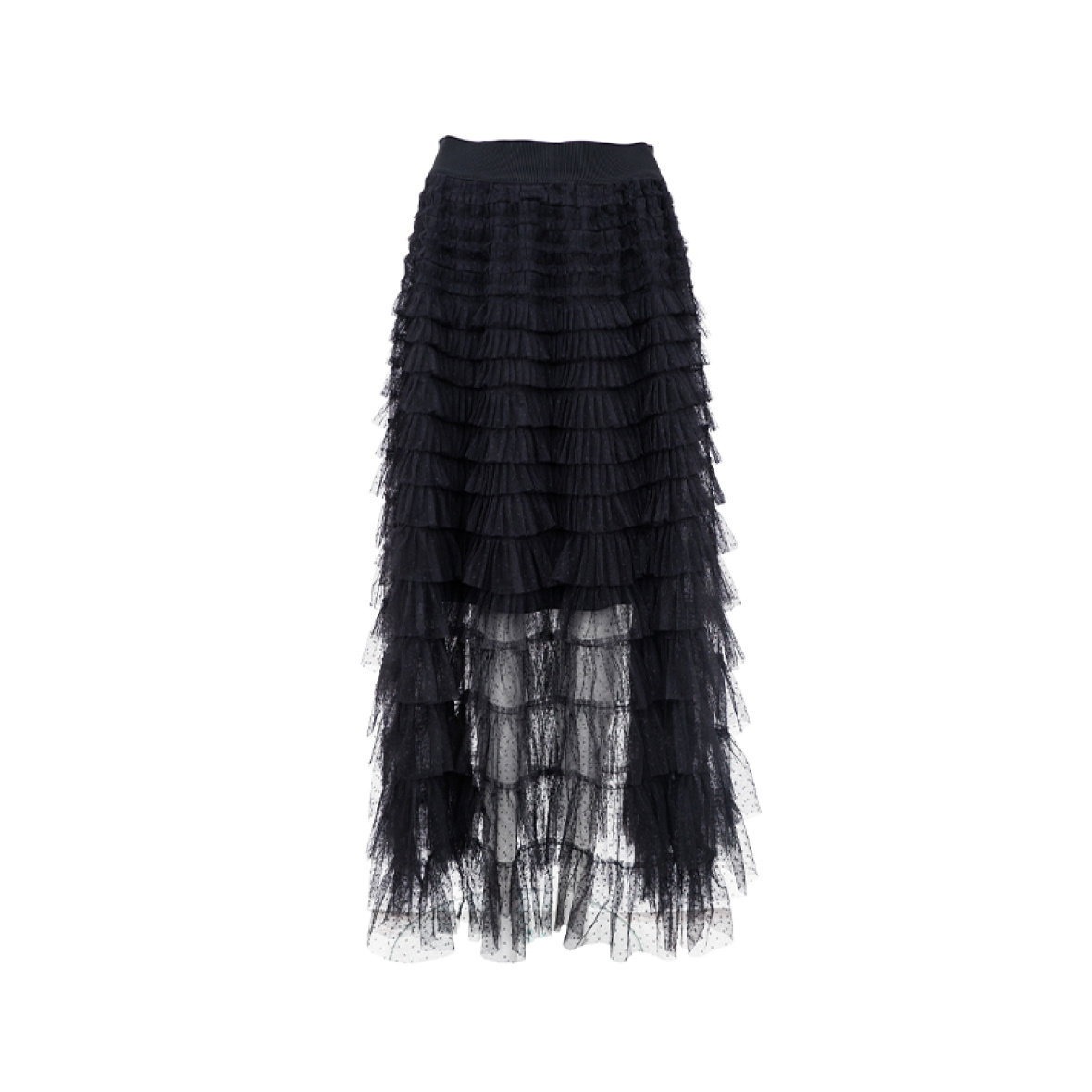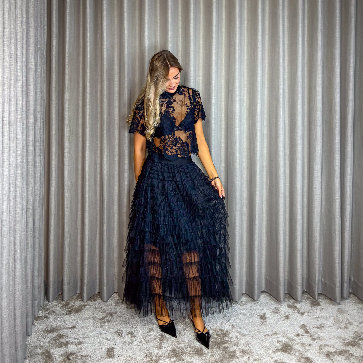 Det lagdelte design med fine flæser giver nederdelen et flot volumen og en legende elegance, der bevæger sig smukt, når du går.