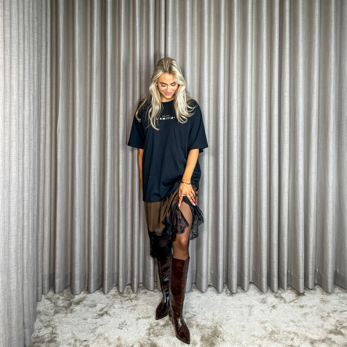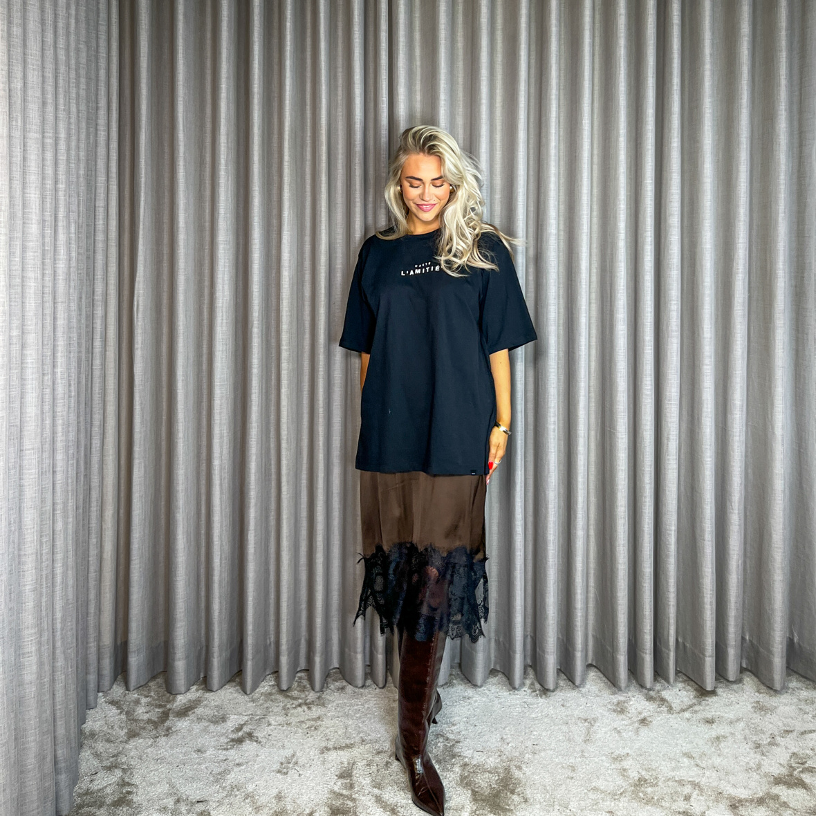 Den sorte blondekant forneden tilfører et eksklusivt og sofistikeret udtryk.