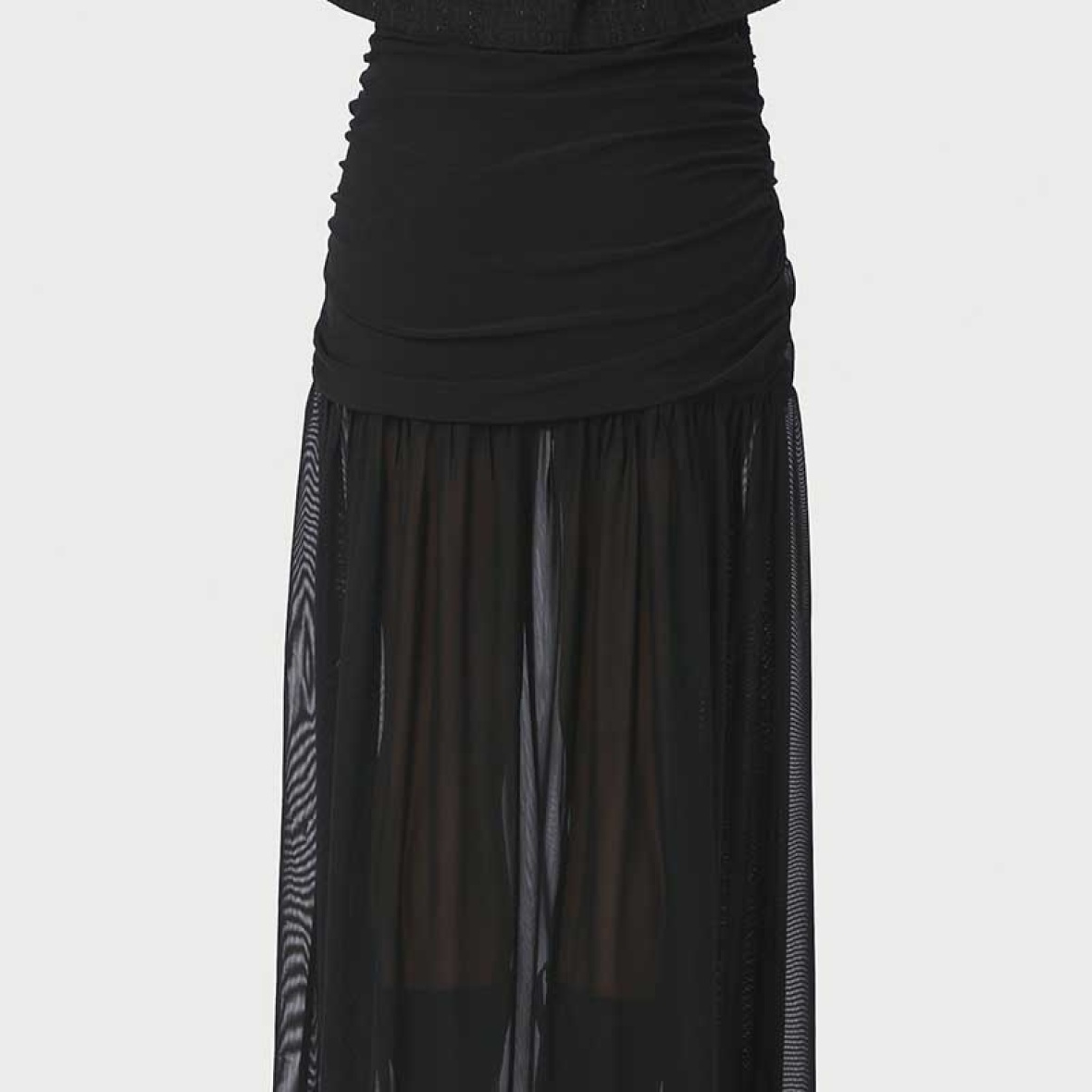 Nederdelen har en tætsiddende, rynket overdel, der fremhæver taljen, og et let transparent chiffonlag, som falder smukt og skaber et feminint og luftigt udtryk.