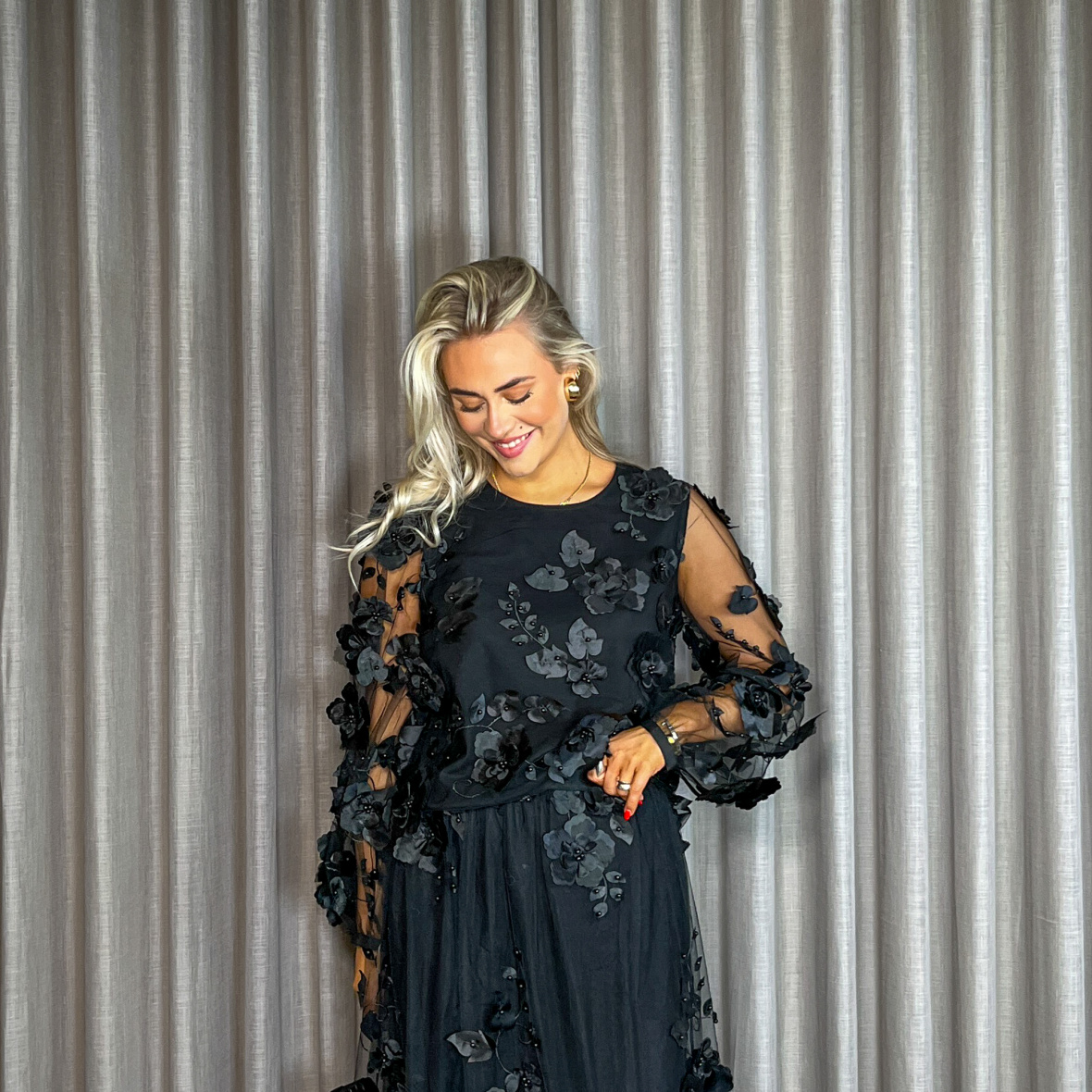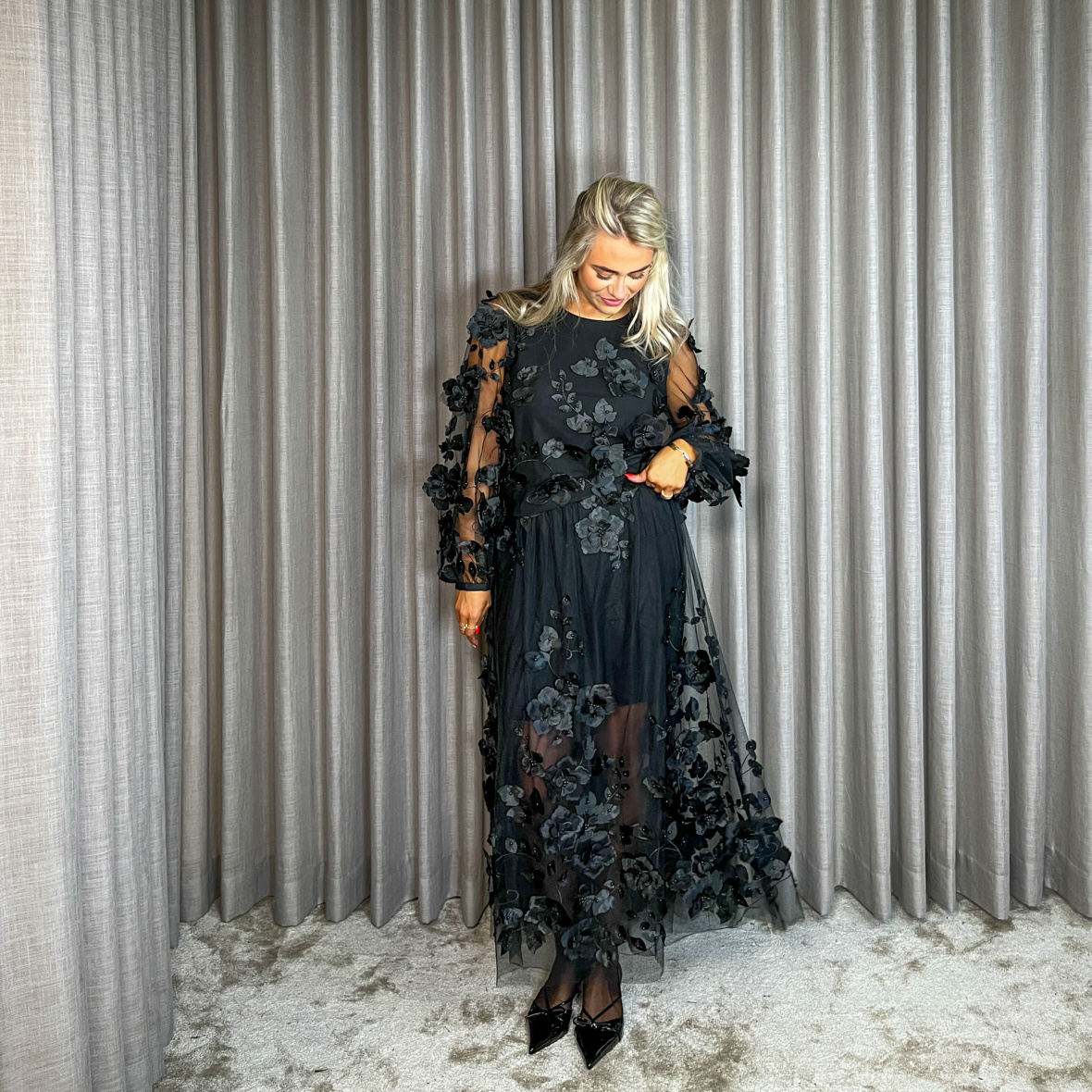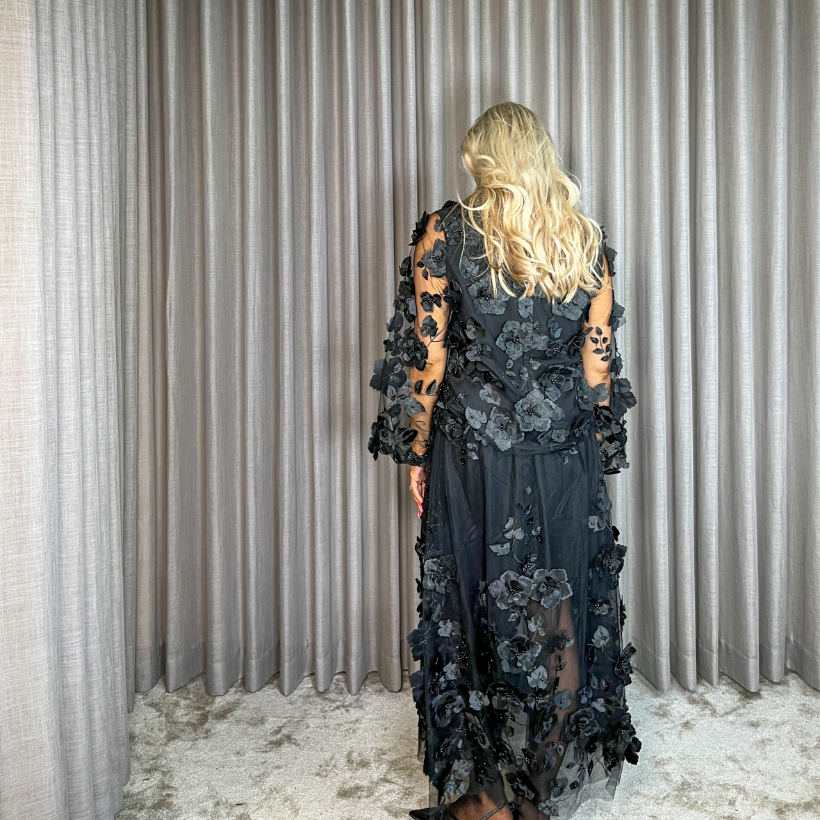 Den lange maxilængde kombineret med de smukke 3D blomsterdetaljer og diskrete perler skaber et feminint og luksuriøst udtryk.