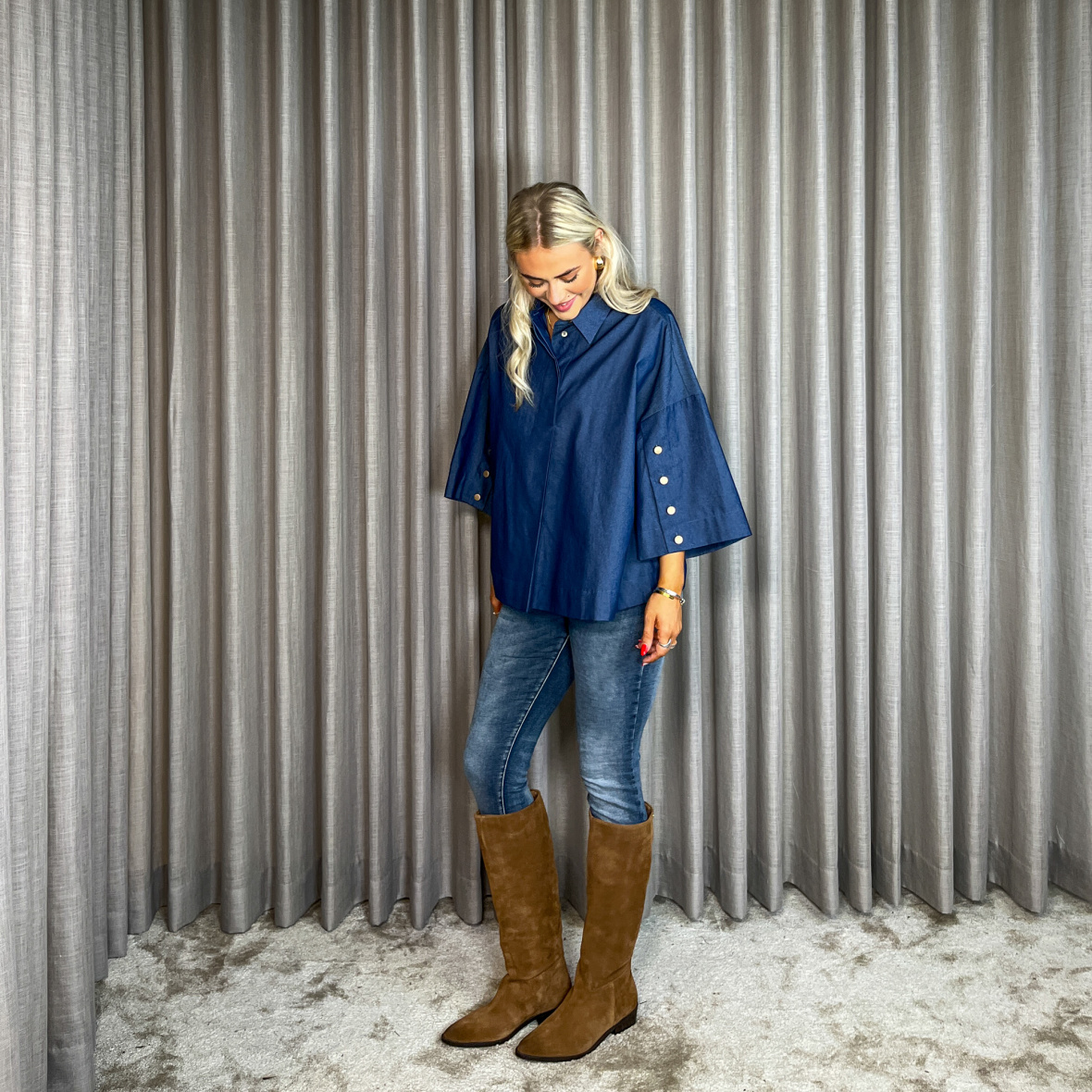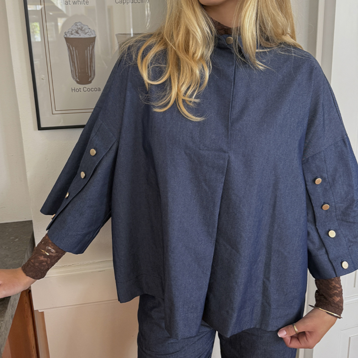 Blå oversize skjorte med krave og trekvarte ærmer.