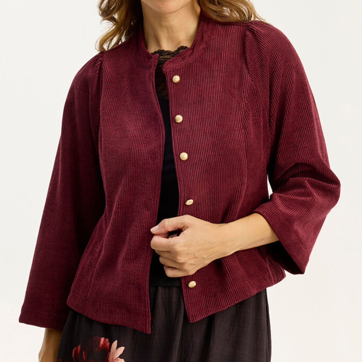 Denne bordeaux jakke i blødt fløjl forener klassisk elegance med et moderne twist.