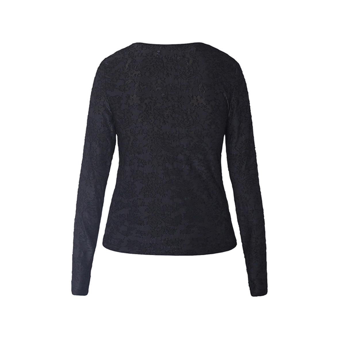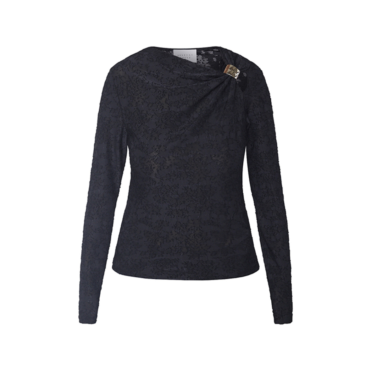 Blusen er fremstillet i et delikat materiale med et diskret, tone-i-tone blondeprint, som giver dybde og struktur til looket.
