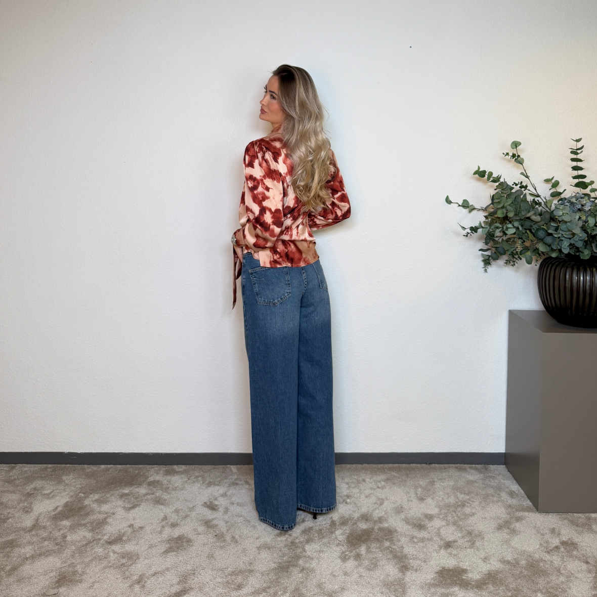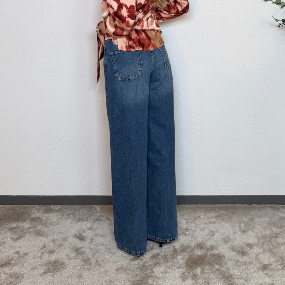 En smuk highwaist jeans i en flot blå vask med elegant vidde i benene.