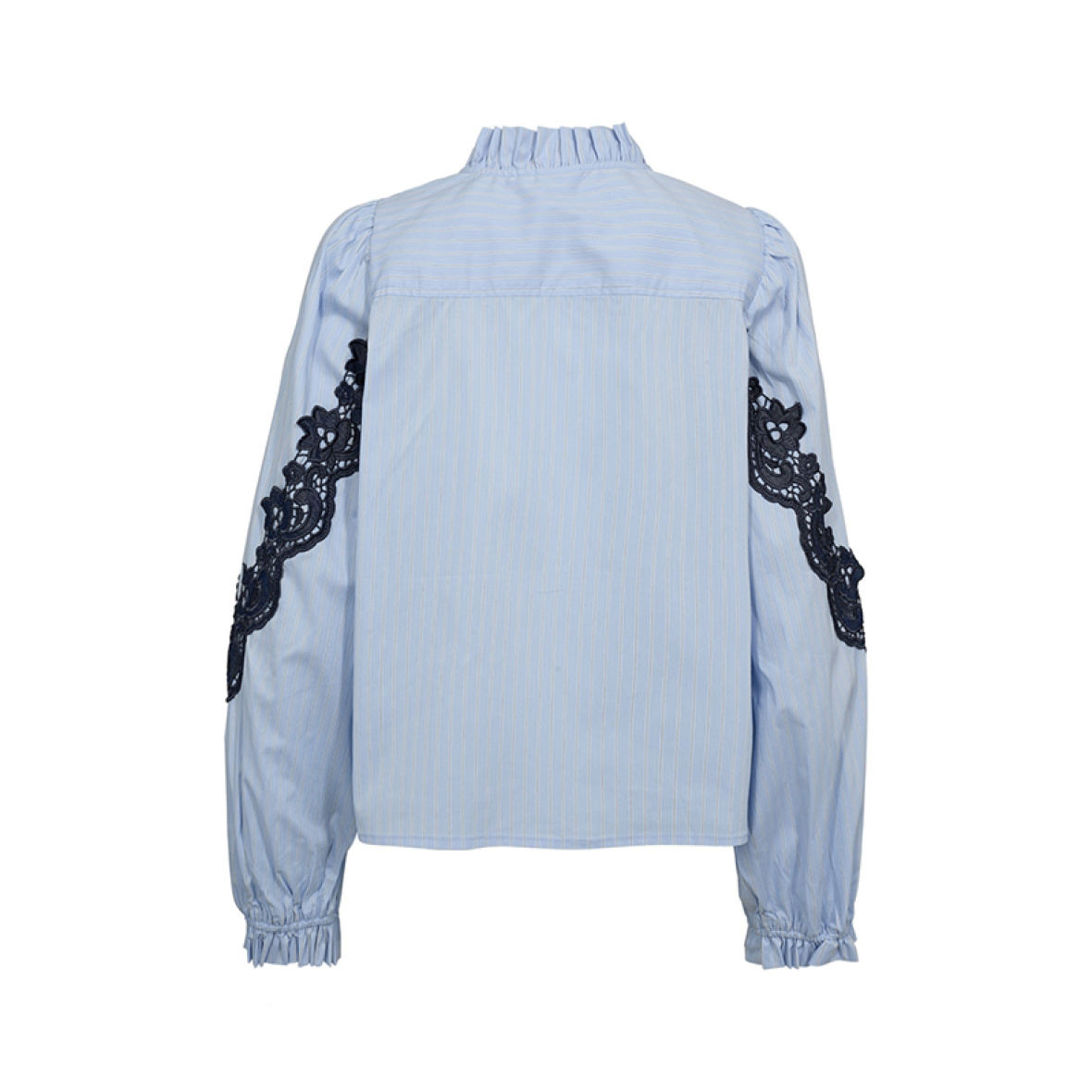 Blusen har fine flæser ved hals og ærmer samt en smuk kontrast blonde, der giver et romantisk udtryk.