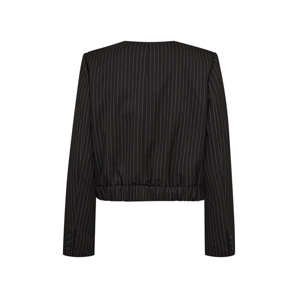 Denne elegante sorte jakke med fine, vertikale nålestriber forener klassisk tailoring med et moderne twist.