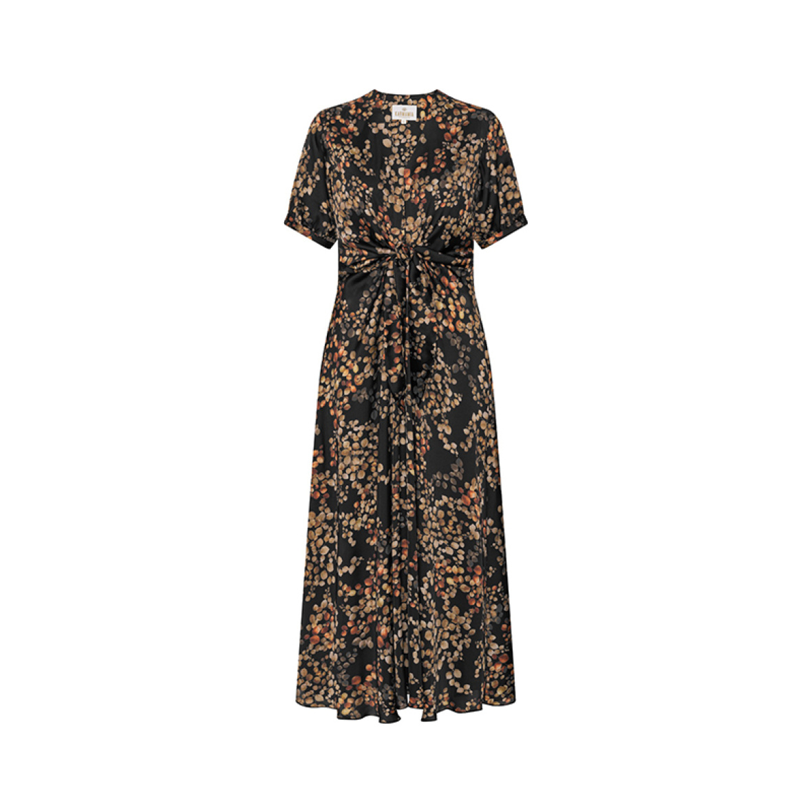 Elegant Karmamia Faye maxikjole med V-udskæring og bindebånd i taljen.