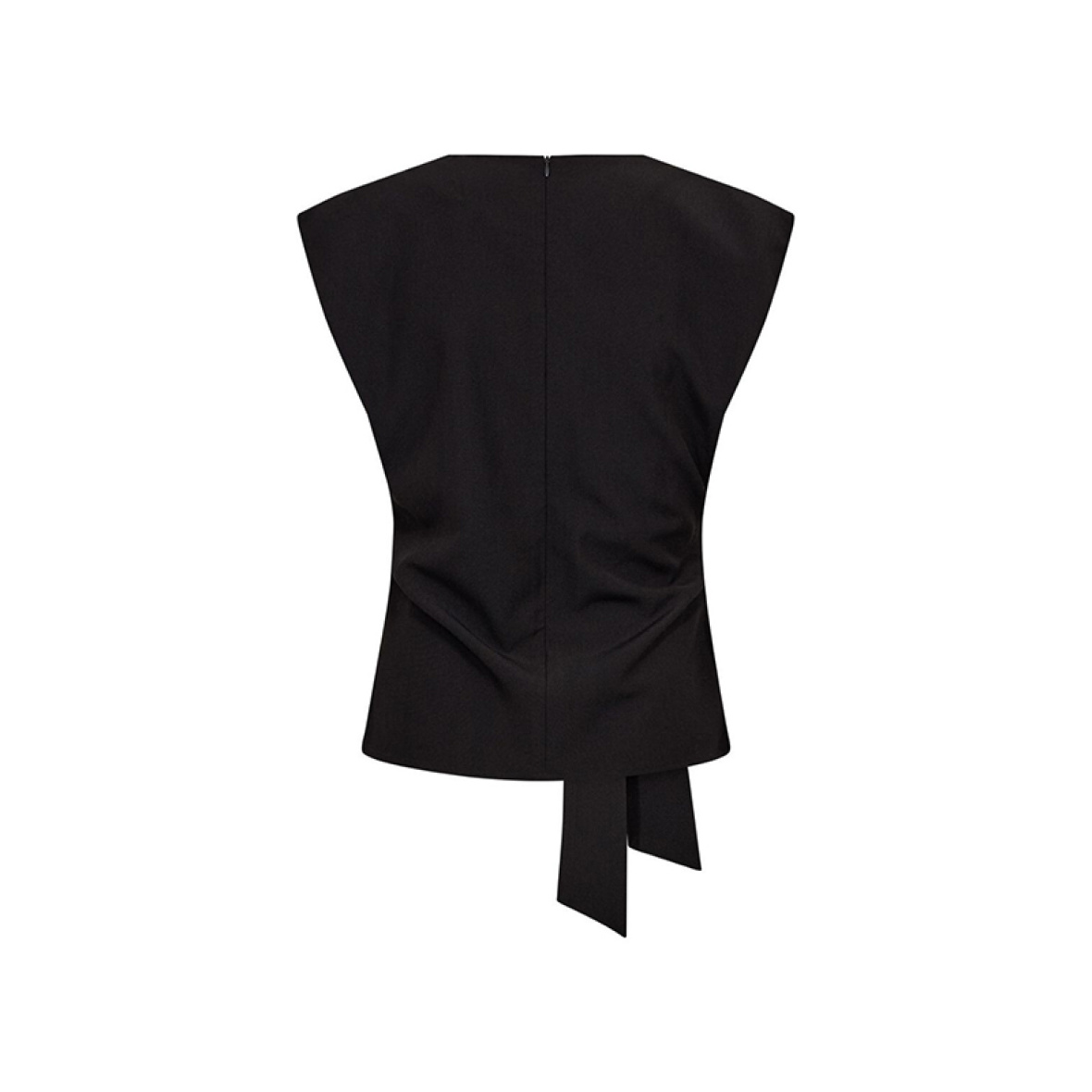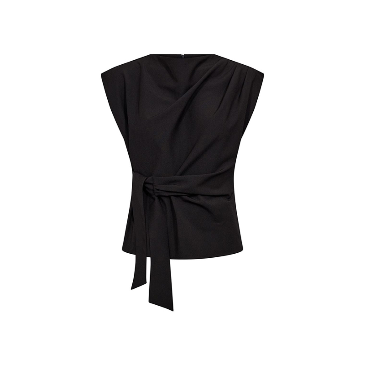 Elegant sort top uden ærmer med smuk drapering ved skulderen og et bindebånd i taljen.