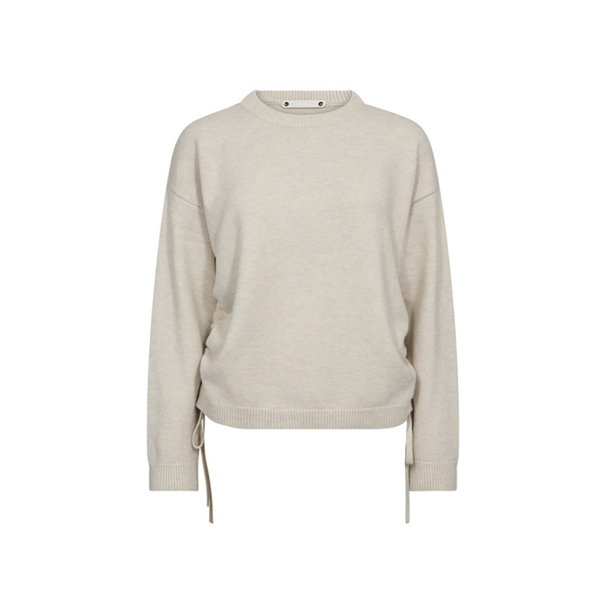 Strikken har rund hals, lange ærmer og fine detaljer med snøre i siderne, som giver mulighed for at justere pasformen.