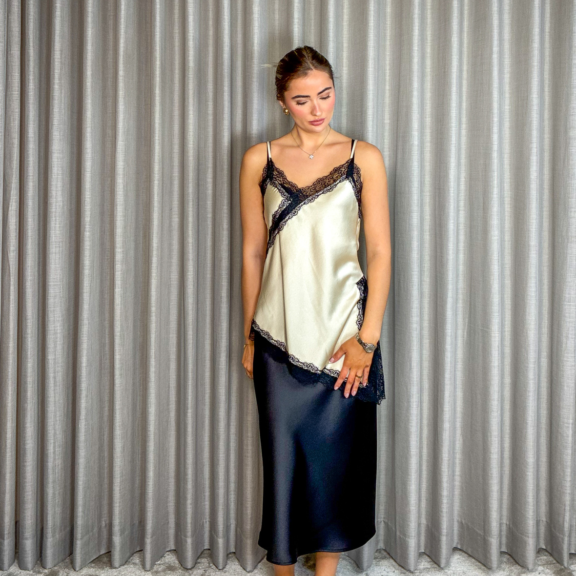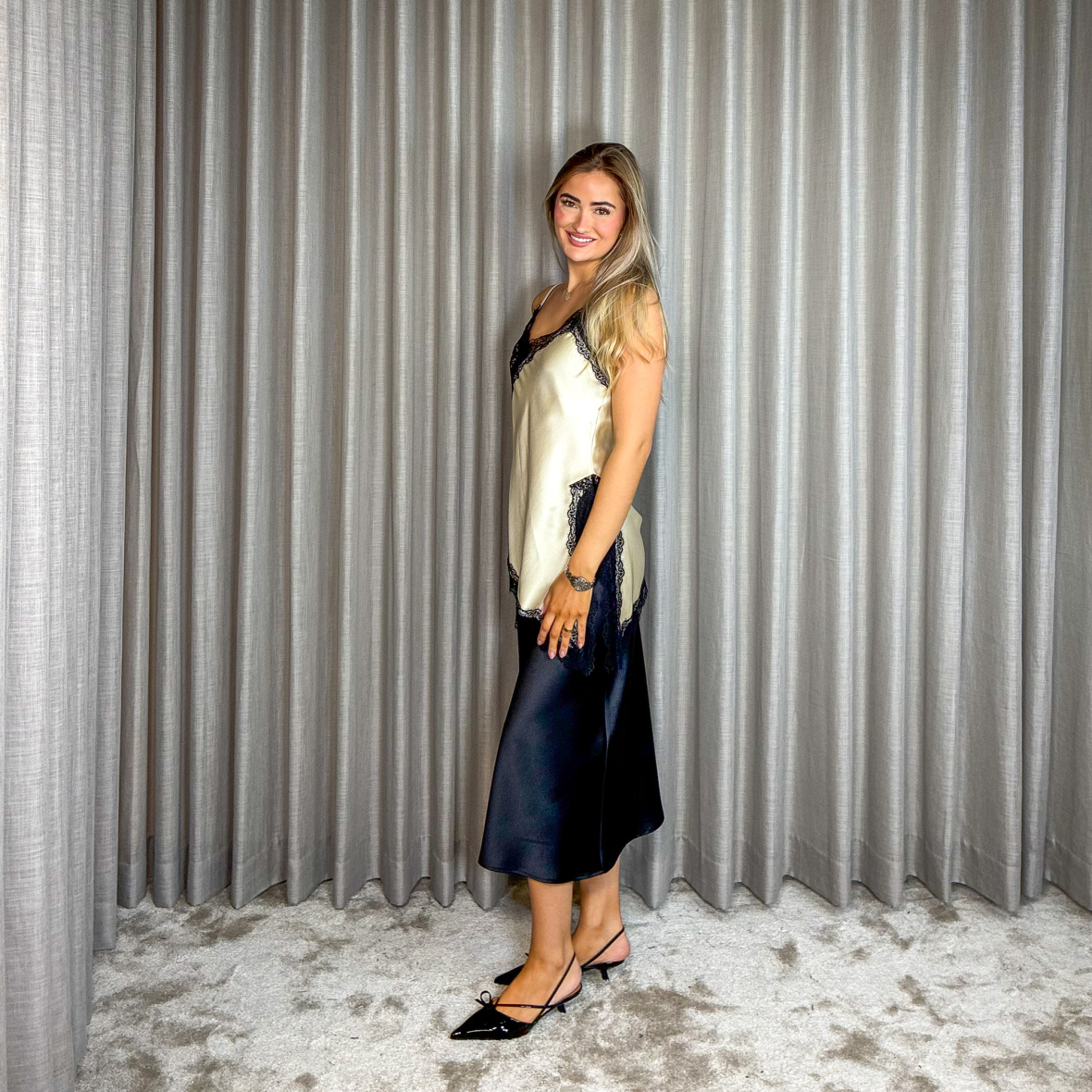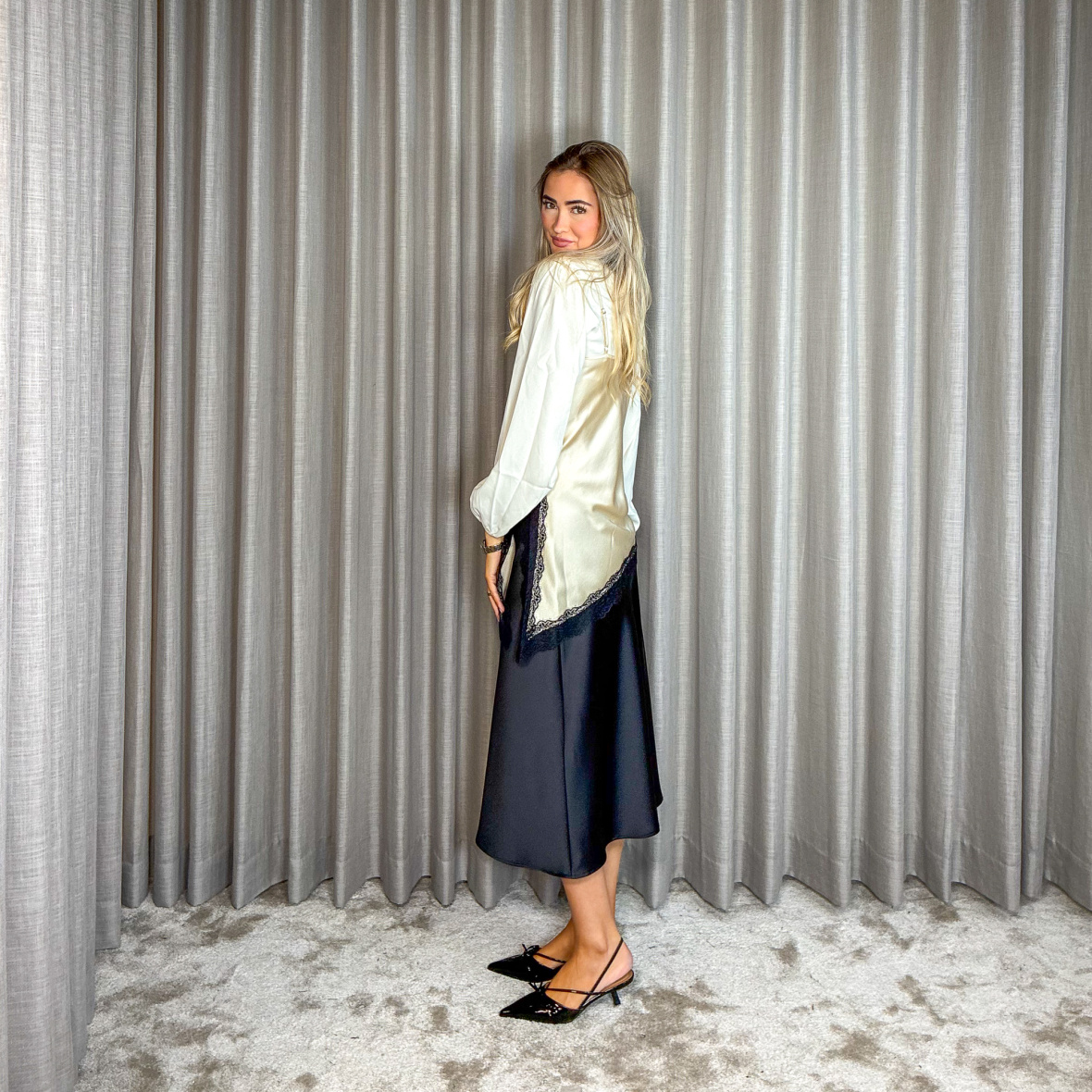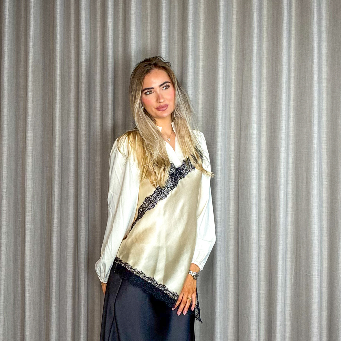 Top fra Imperial med asymmetrisk snit og fine blondekanter ved hals og kant.