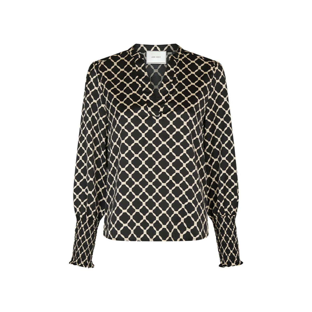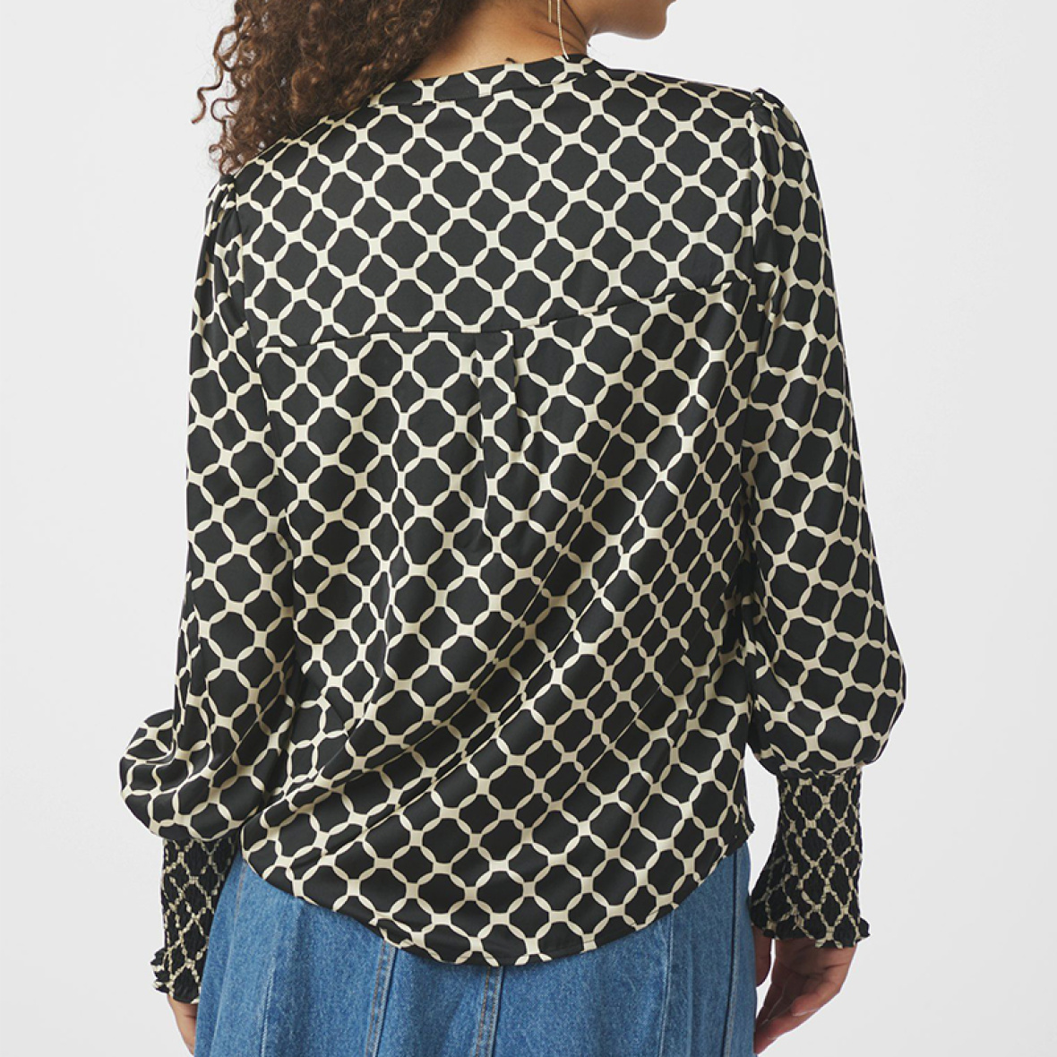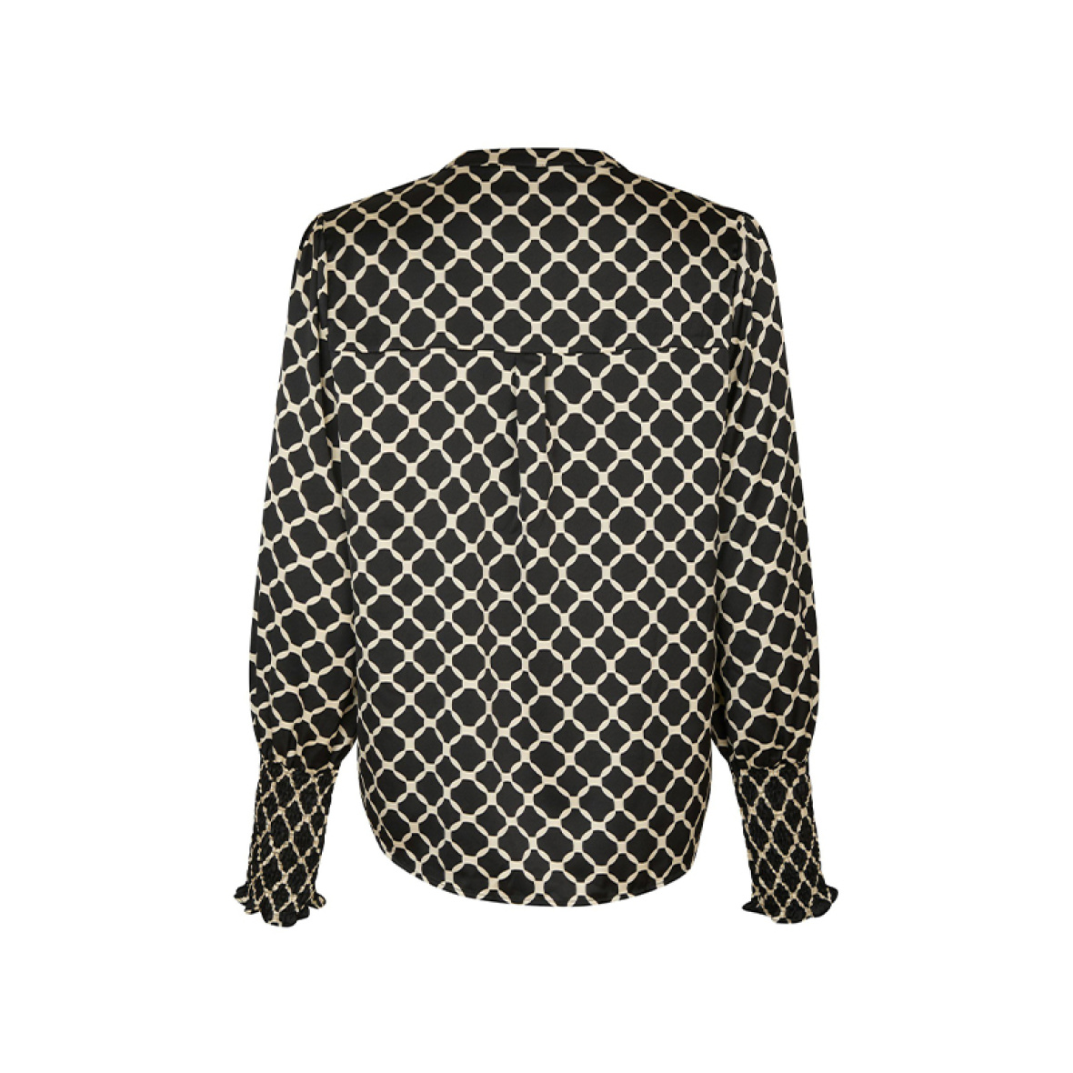 Smuk mønstret bluse i sort og beige med et elegant grafisk print.
