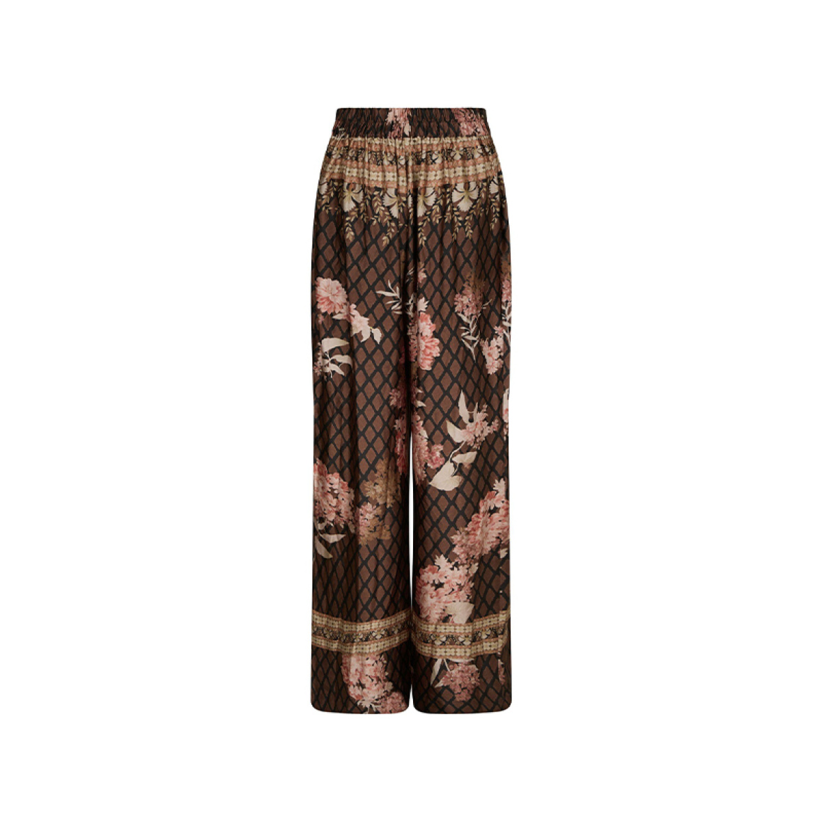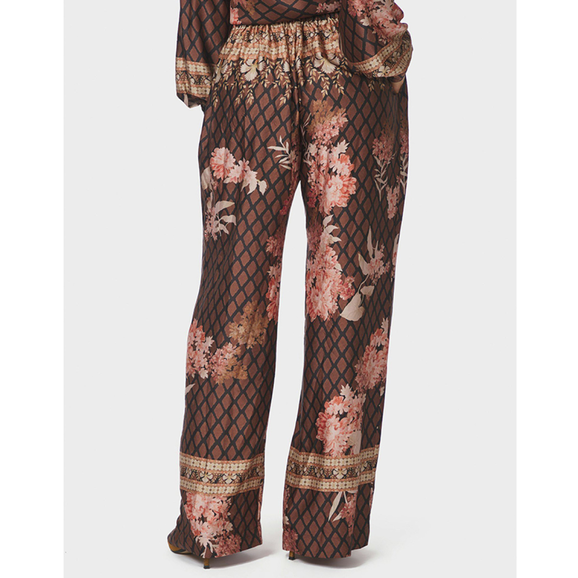 Bukserne har elastik i taljen, brede ben og et elegant print, der matcher den tilhørende bluse.