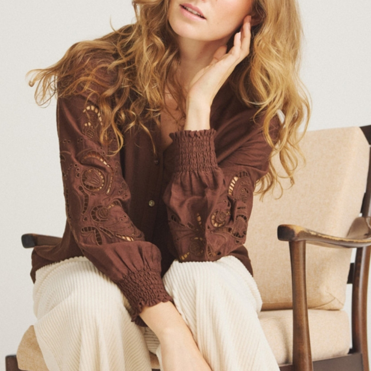 Feminin skjorte fra luxzuz // one two med smukke ærmer med hulmønster.