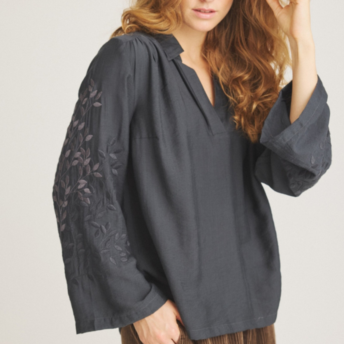 Den fine V-udskæring med krave giver et feminint udtryk, mens de brede ærmer med tone-i-tone broderier tilføjer et eksklusivt touch.