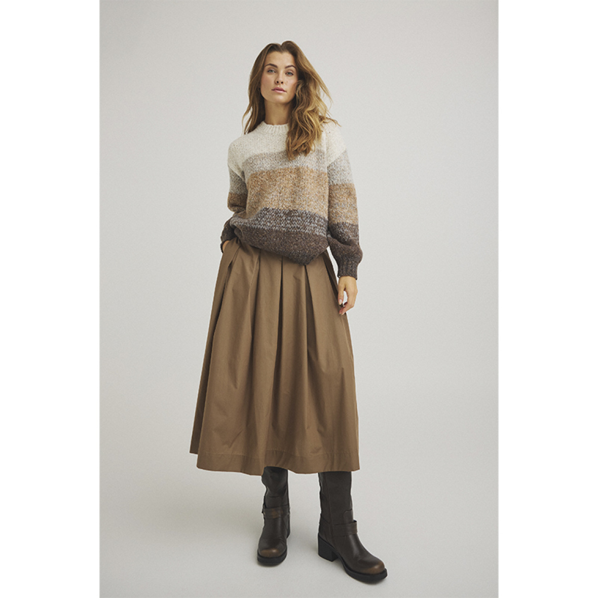 De bløde farveovergange i creme, beige og brune nuancer giver et harmonisk og naturligt udtryk,