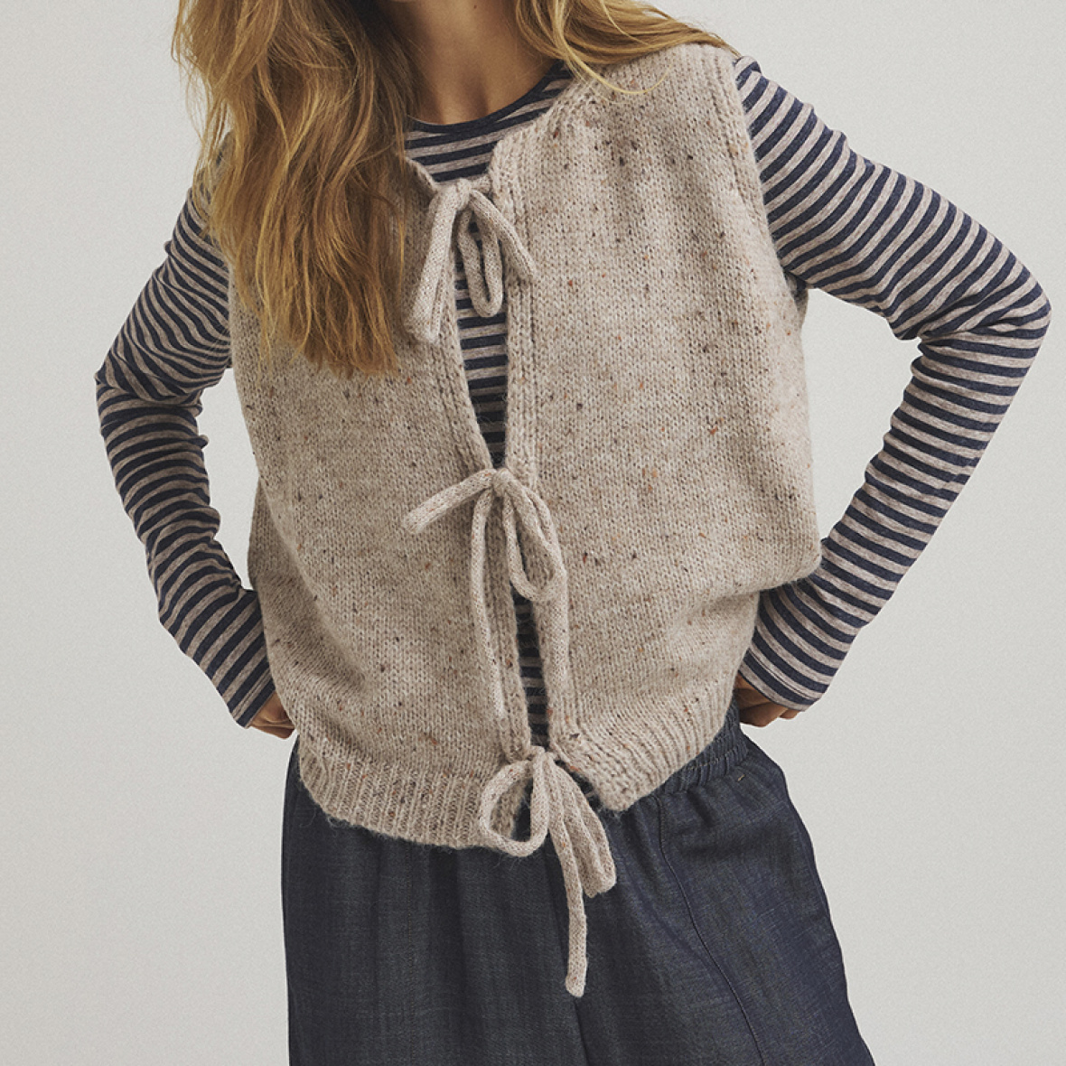 Den melerede struktur giver et elegant og naturligt udtryk, mens de fine bindedetaljer foran tilfører et feminint og stilrent twist.