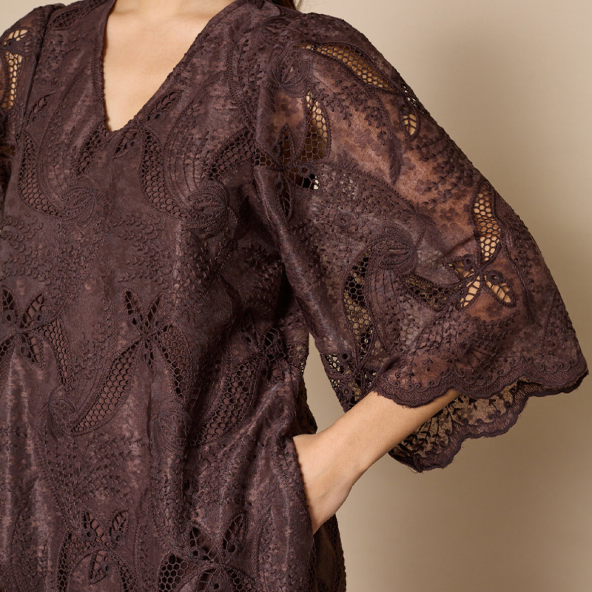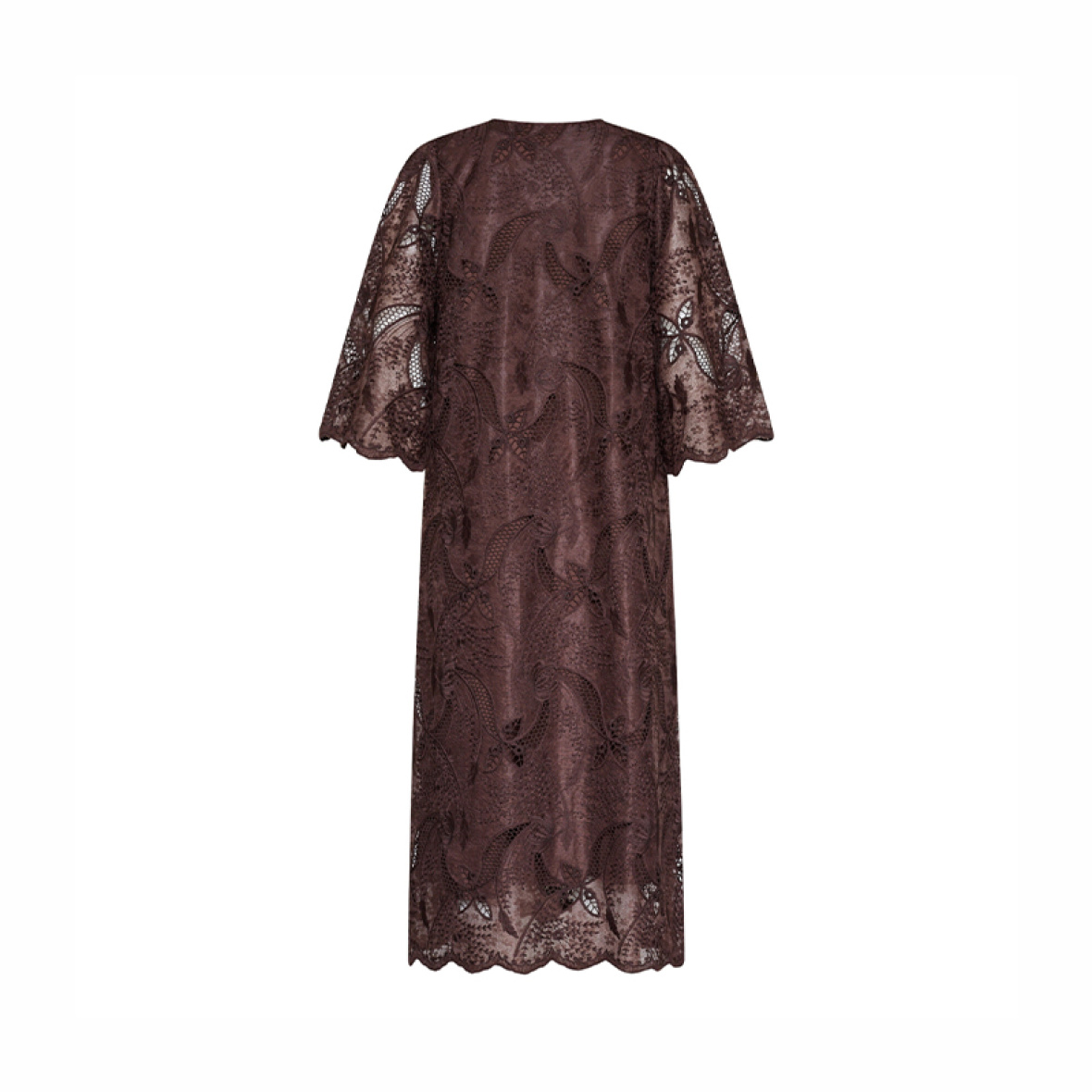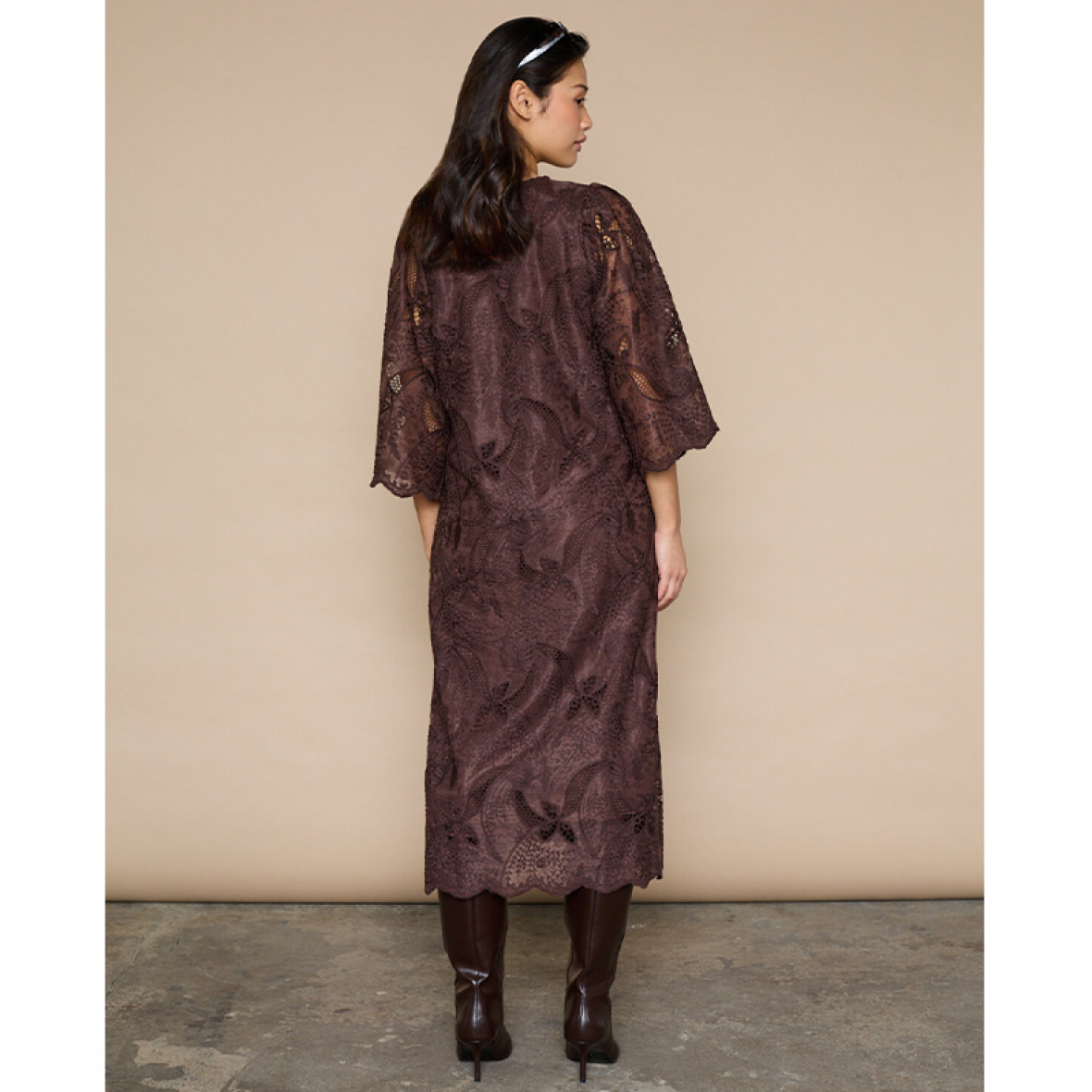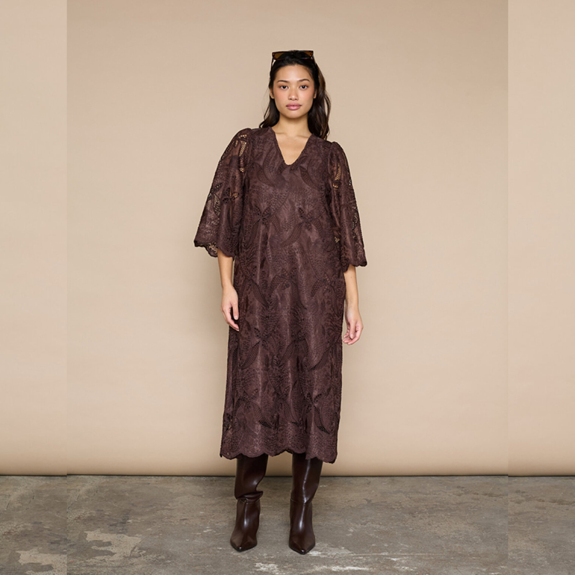 Love1444 er en smuk og feminin blondekjole i midi længde.