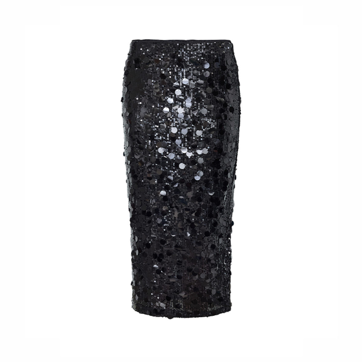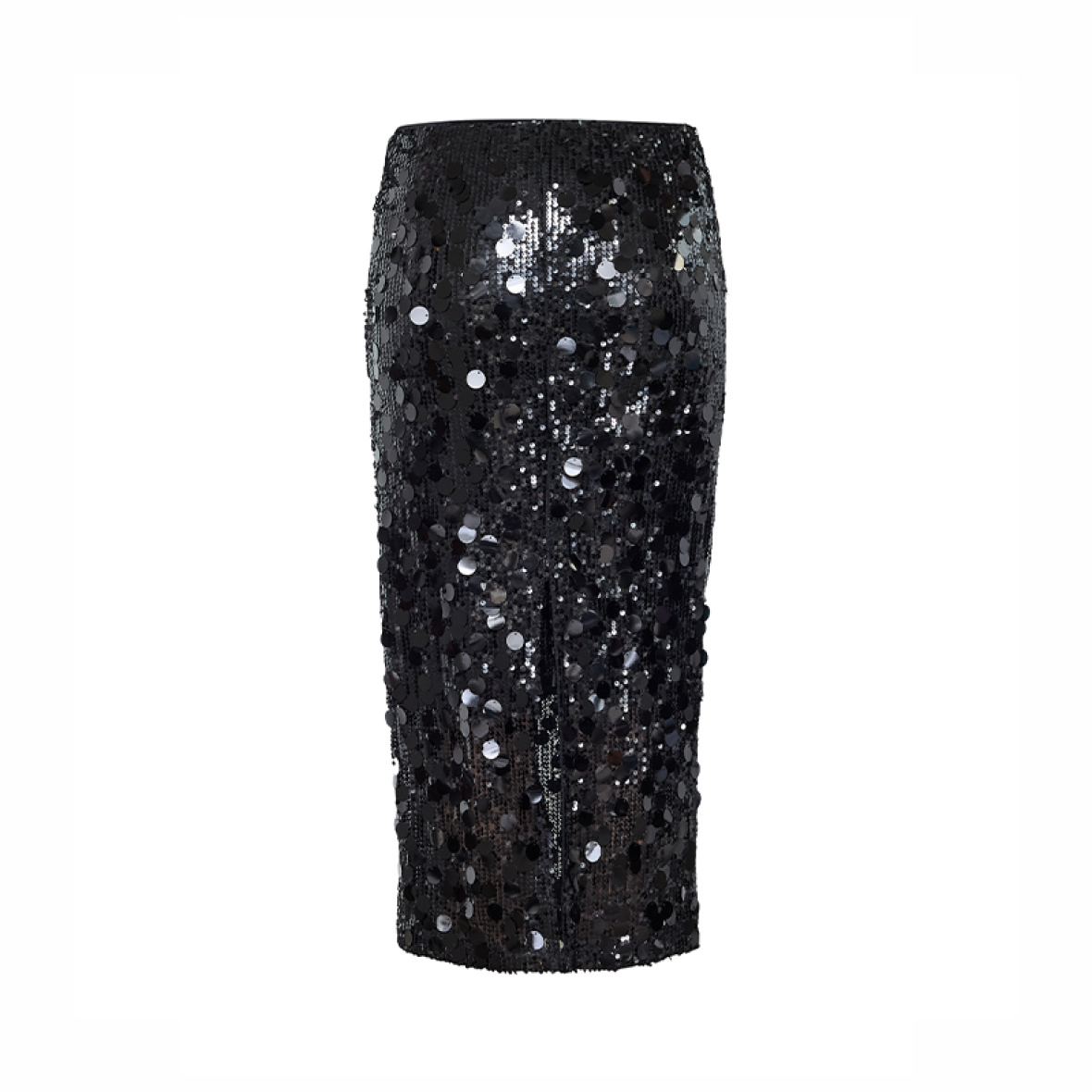 Hele nederdelen er dækket af store, skinnende pailletter, der overlapper og giver et eksklusivt udtryk.