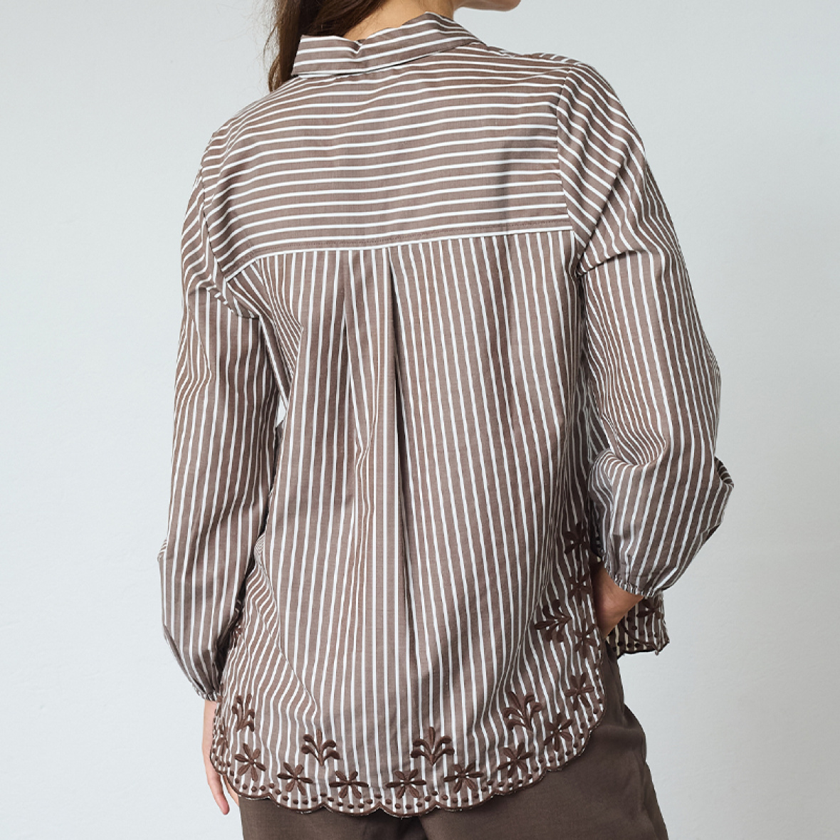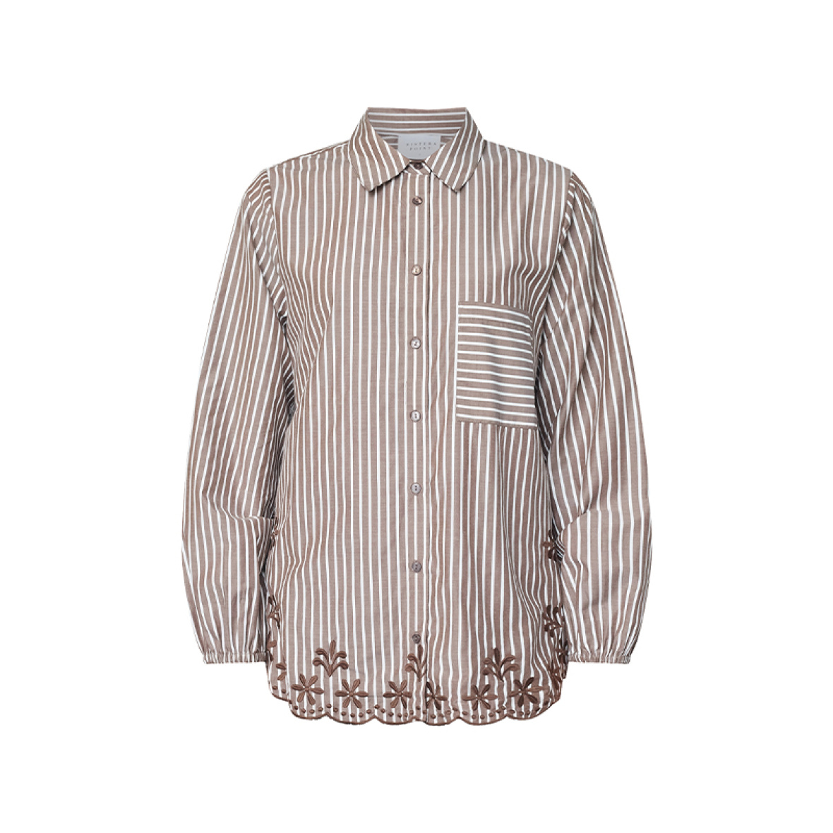 Skjorten er lavet i et vævet materiale og har et fint broderi nederst, der tilføjer et elegant touch.