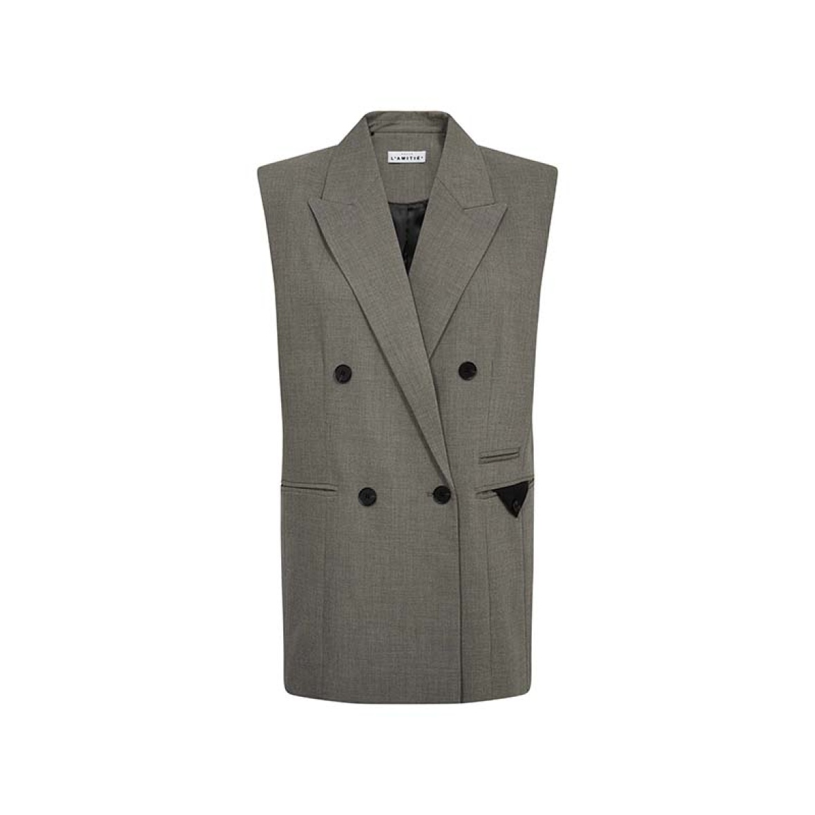 Vesten har en klassisk revers, skjulte lommer og et langt, elegant snit.