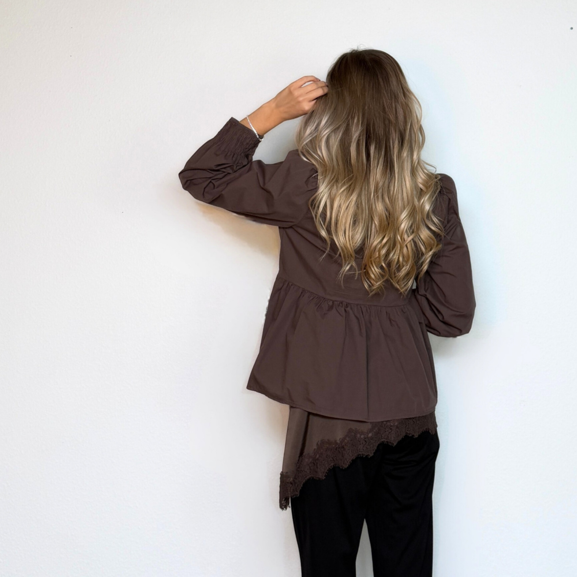 Brun top fra Gossia med asymmetrisk kant og fine blondedetaljer ved hals og søm.