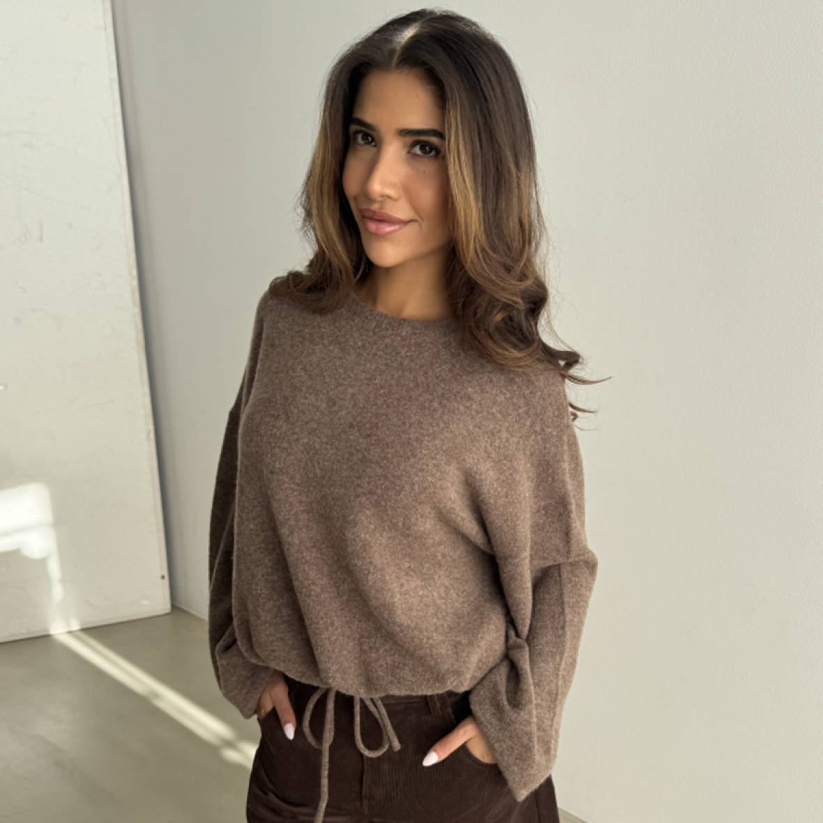 Den har lange ballonærmer med elastik ved kanten og en justerbar snor, som giver et blødt og feminint udtryk.